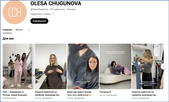 Канал будет логичным продолжением нашей диджитал-вселенной OCH, дополняя аккаунты в наших других социальных сетях. Мы планируем снимать много интересного контента про наше производство: показывать его закулисье, рассказывать про новинки коллекций, обсуждать актуальные темы швейного бизнеса и многое другое.