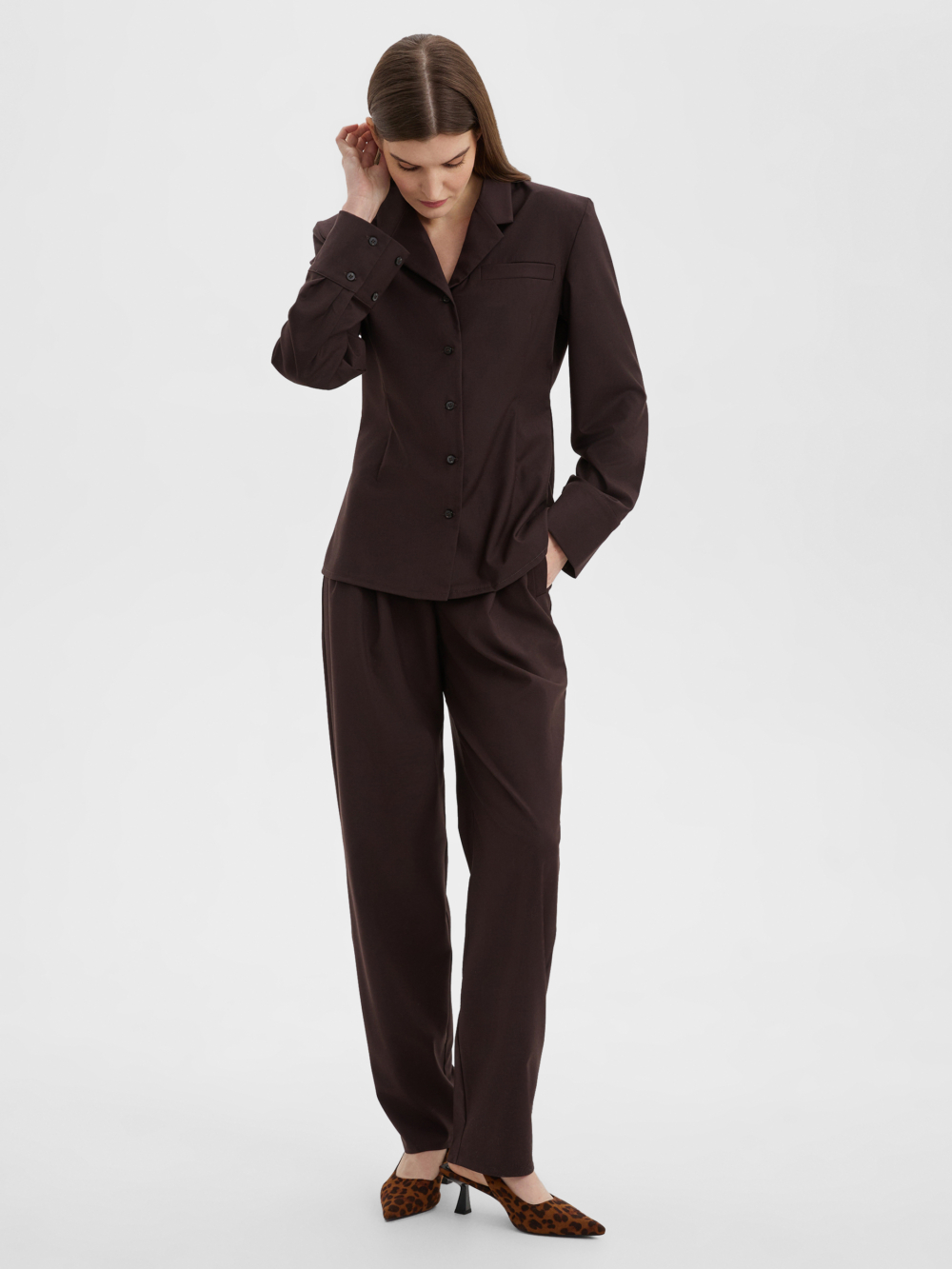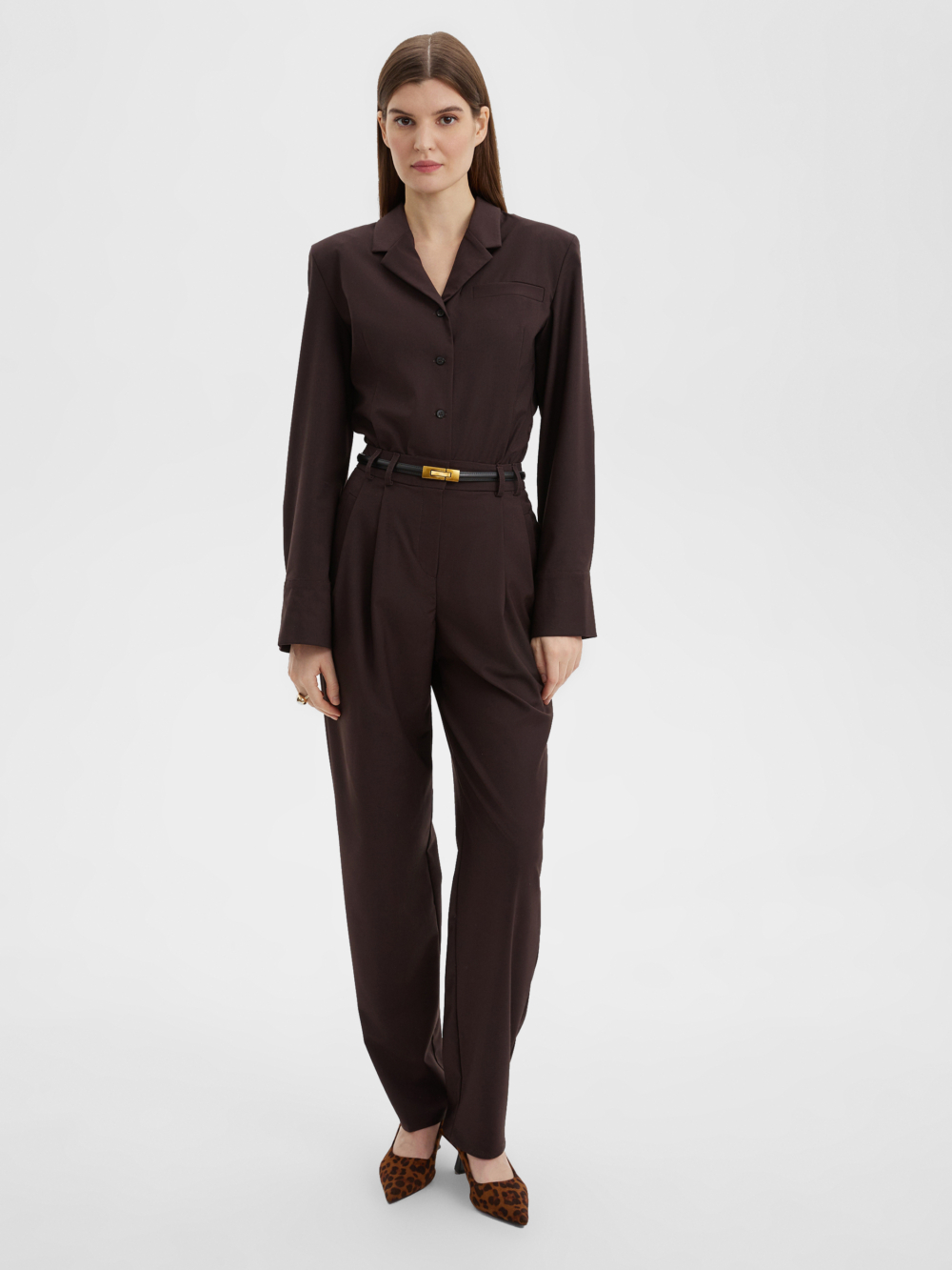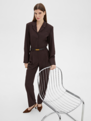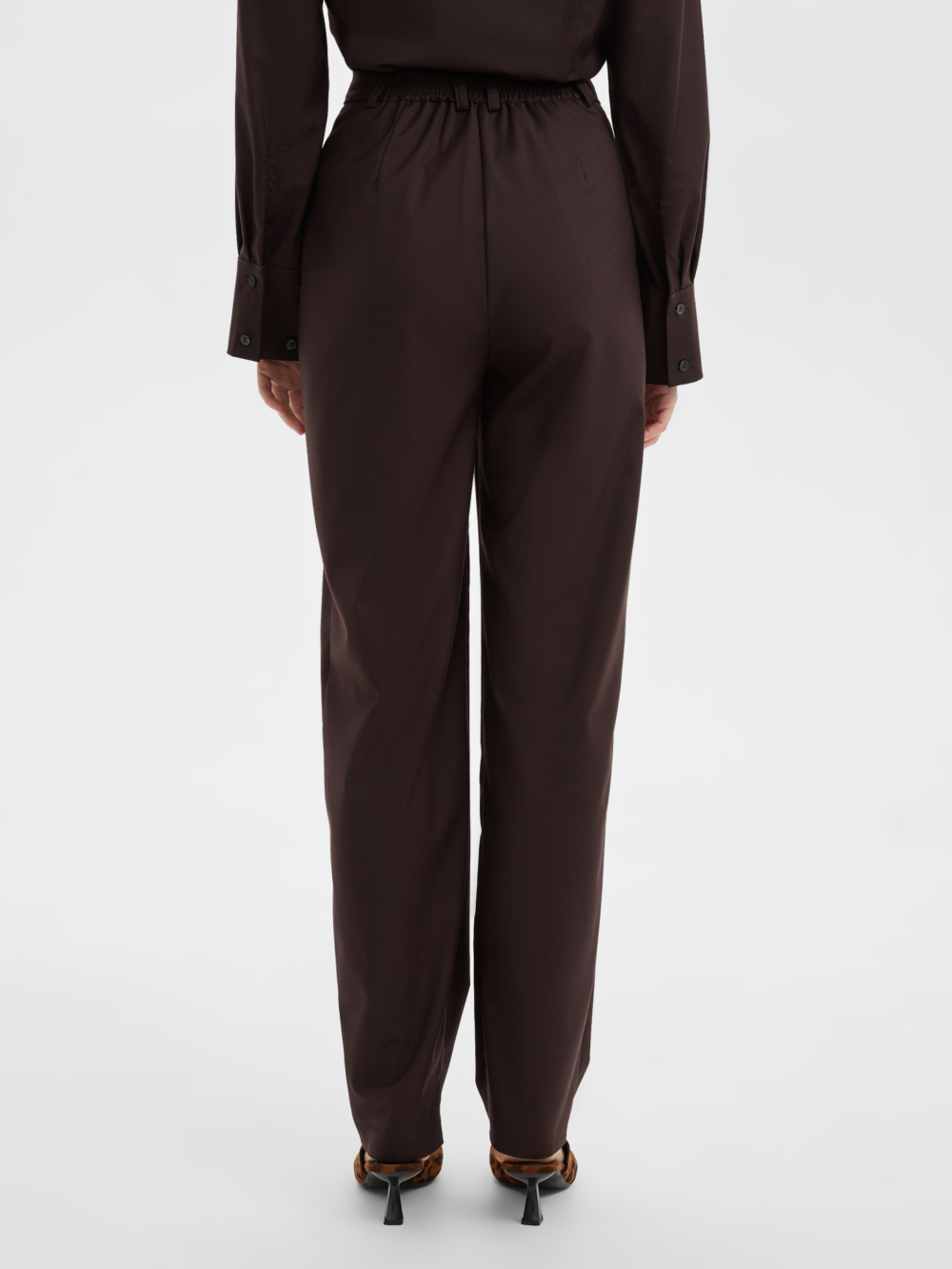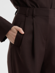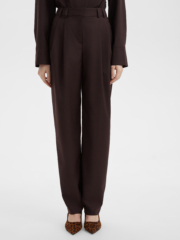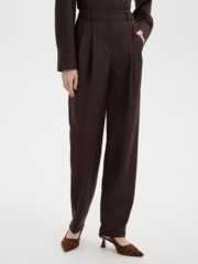 Свободные стильные брюки со складками слегка зауженные к низу с легкостью впишутся в любой гардероб. Комфортную посадку на талии обеспечивает резинка расположенная на задней половинке пояса. Костюмная ткань благородного шоколадного цвета на основе натуральных и синтетических волокон обладает гигроскопичностью и износостойкостью, тактильно приятна. Комбинируйте их рубашкой из нашей коллекции для создания строгого и завершенного образа. Отличный выбор выбор как для офиса и университета, а так и для вечерних выходов на мероприятие, стоит только разбавить образ аксесуарами.