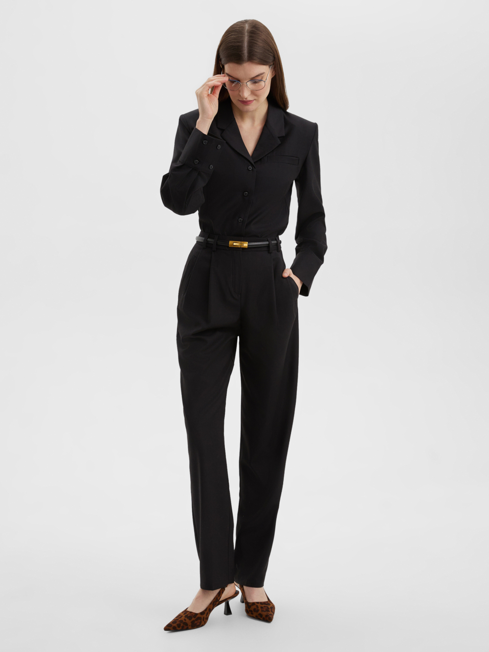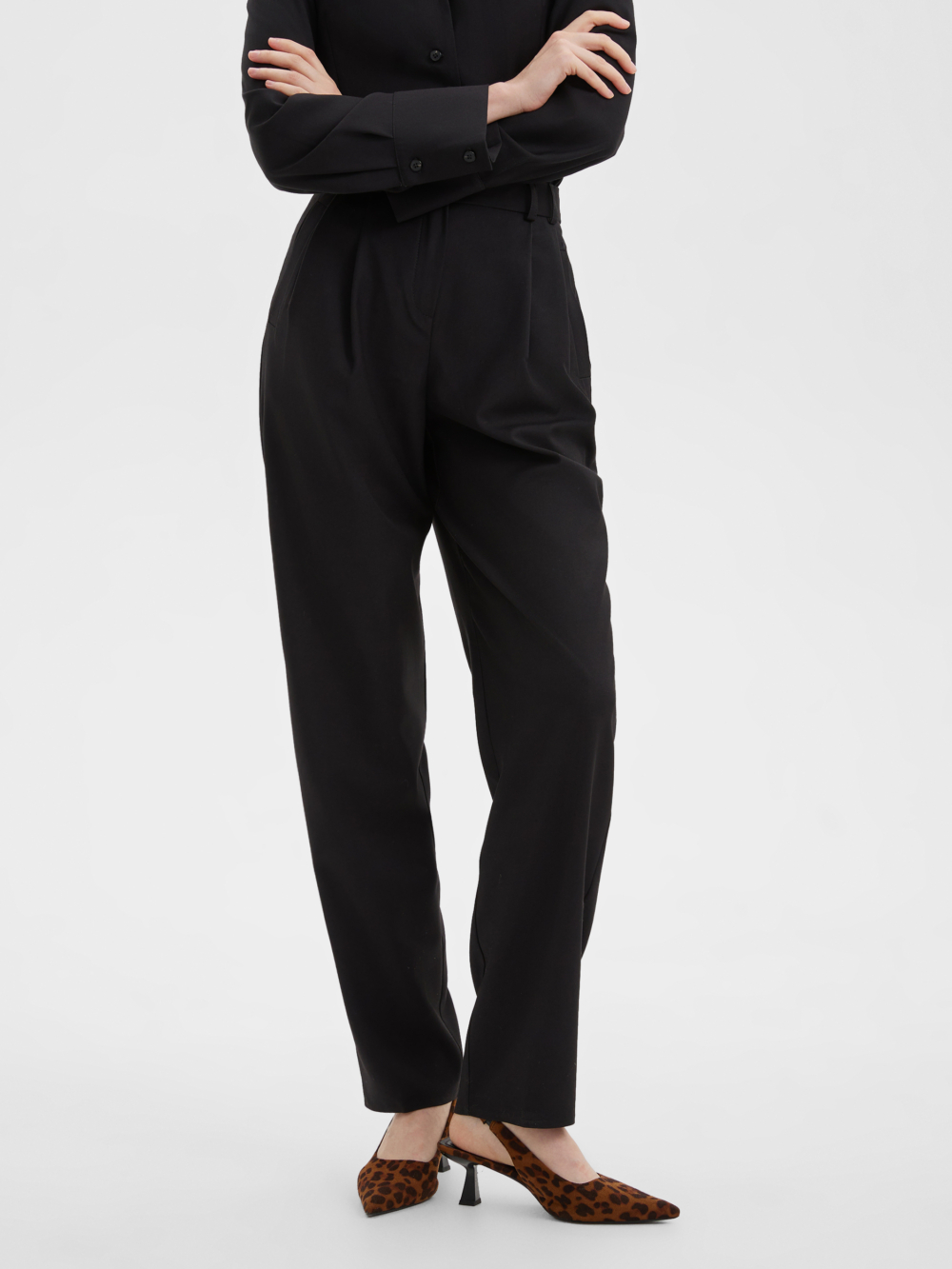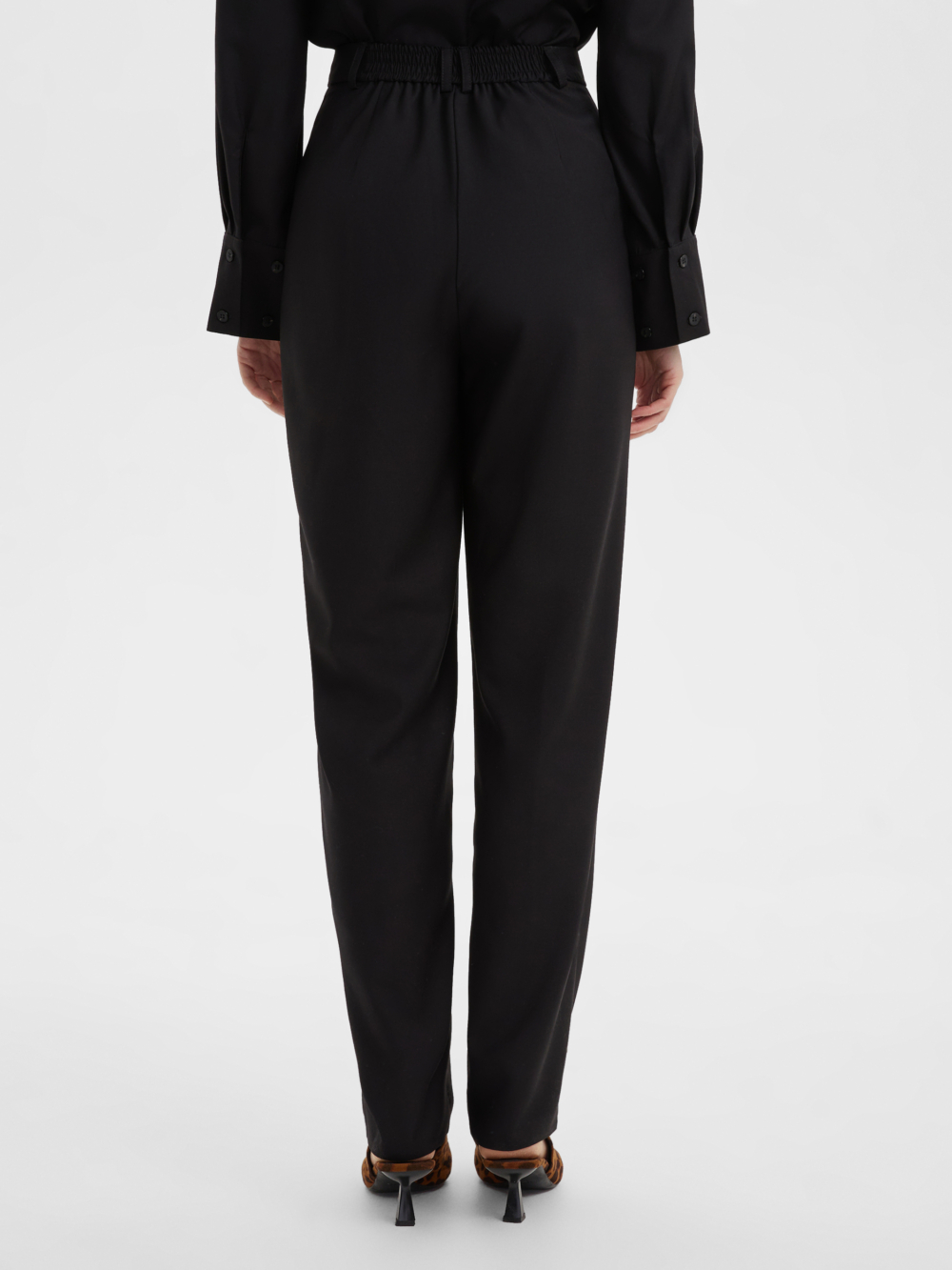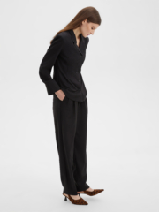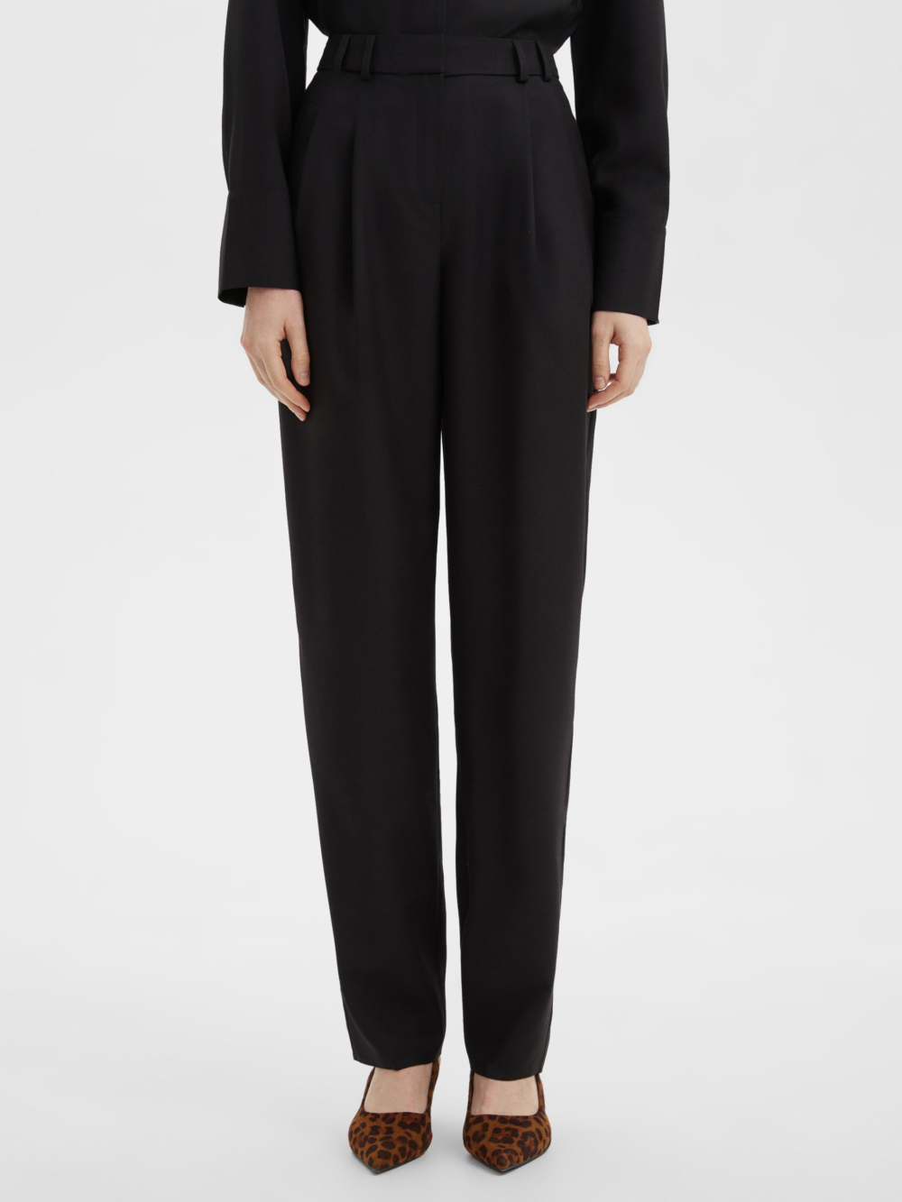 Свободные стильные брюки со складками слегка зауженные к низу с легкостью впишутся в любой гардероб. Комфортную посадку на талии обеспечивает резинка расположенная на задней половинке пояса. Костюмная ткань благородного черного цвета на основе натуральных и синтетических волокон обладает гигроскопичностью и износостойкостью, тактильно приятна. Комбинируйте их рубашкой из нашей коллекции для создания строгого и завершенного образа. Отличный выбор выбор как для офиса и университета, а так и для вечерних выходов на мероприятие, стоит только разбавить образ аксесуарами.