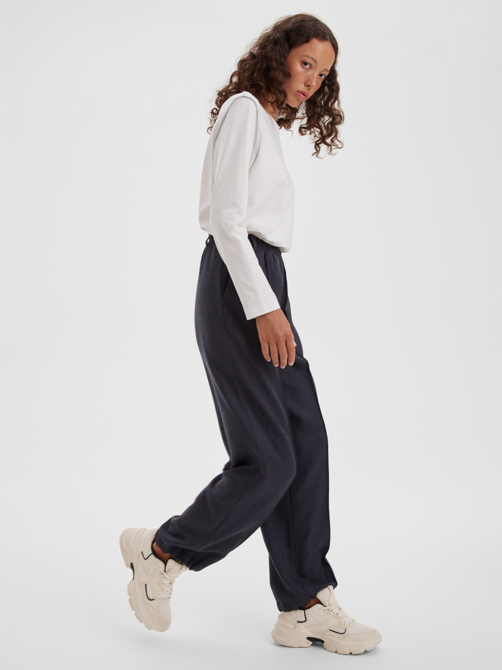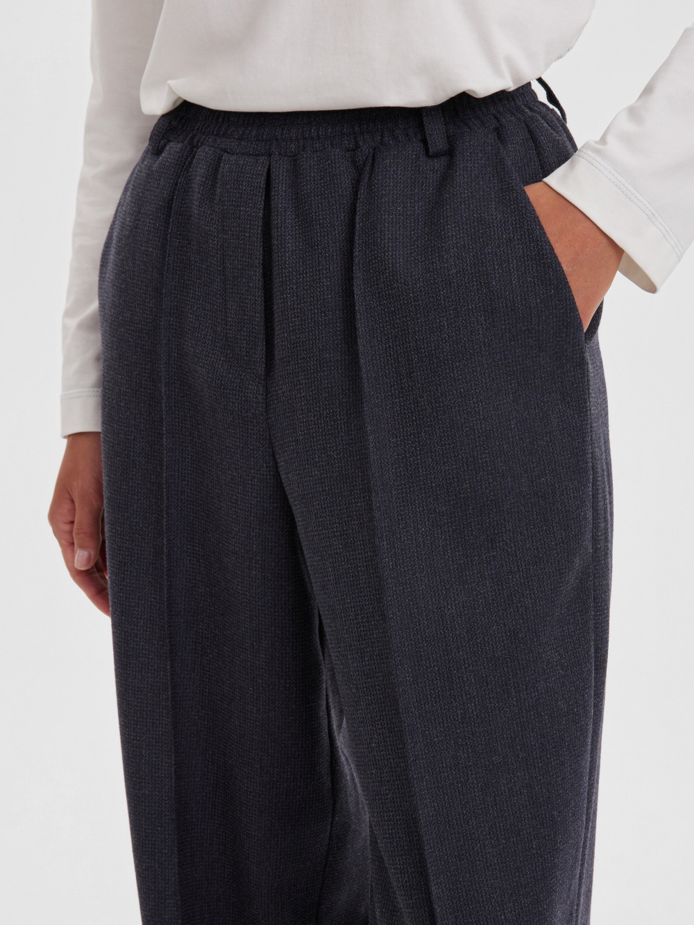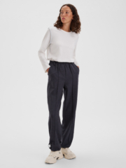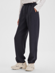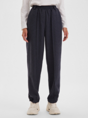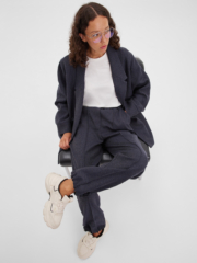 Стильные багги из шерстяной ткани тёмно-синего цвета с лёгкостью впишутся в нестрогий офисный или повседневный гардероб любой модницы. Резинка по талии и регулировка ширины по низу брюк обеспечивают максимально удобную посадку, что позволяет носить брюки с комфортом на повседневной основе. Багги можно сочетать с комплектным жакетом оверсайз или носить с рубашками и лонгсливами, создавая актуальные образы на каждый день.