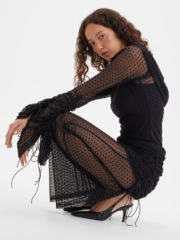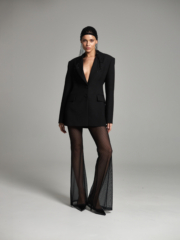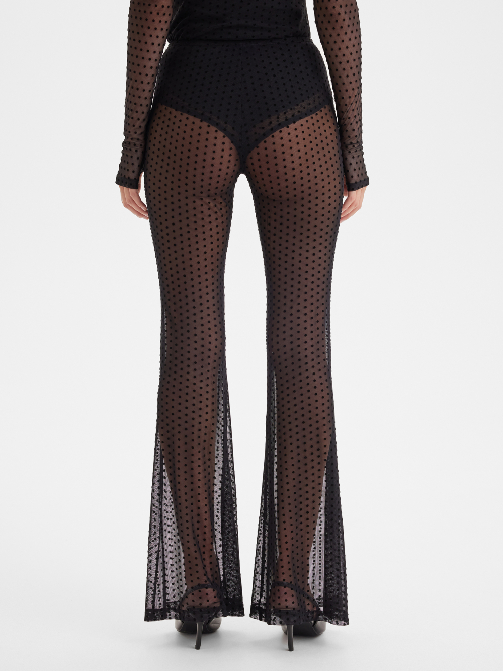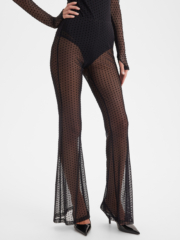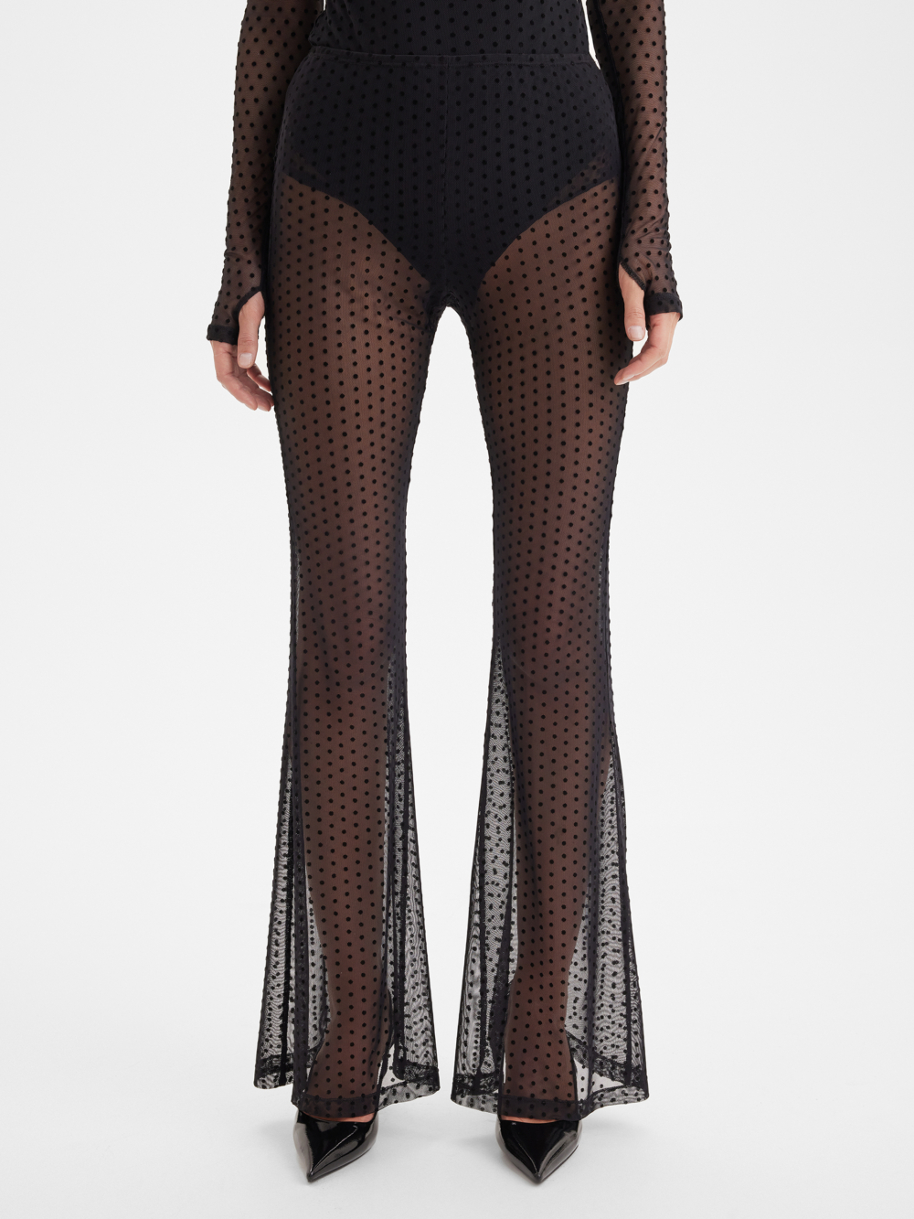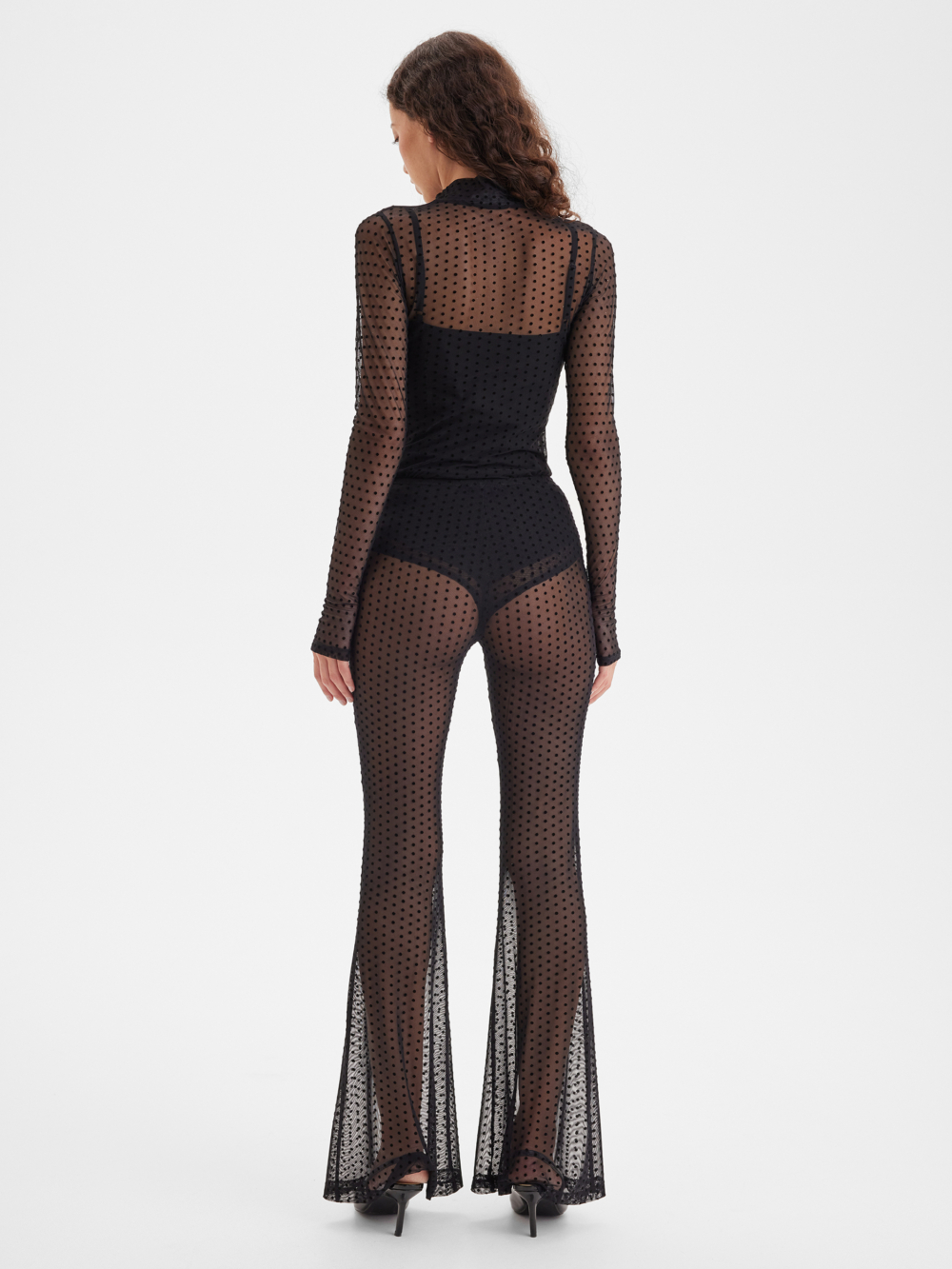 Стильные брюки буткат из полупрозрачной сетки в мелкий бархатный горошек прекрасно вытягивают силуэт, добавляя нотку остроты в ваш образ. Стилизуйте их с боди и жакетом прилегающего силуэта из нашей новогодней коллекции. А для создания ещё более загадочного образа вы можете добавить акцентное болеро с капюшоном и мини-юбку на кулиске.