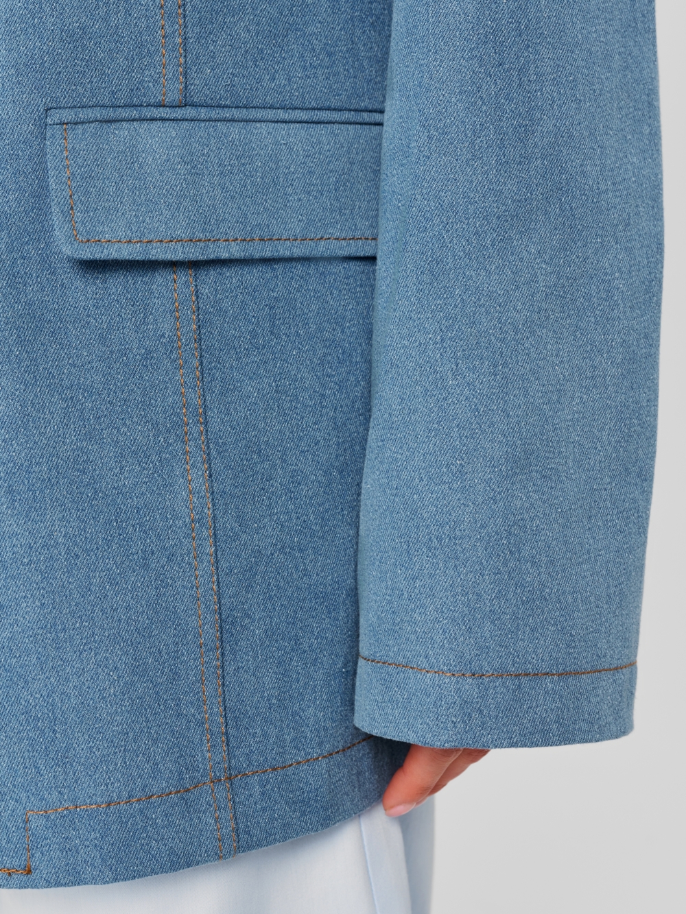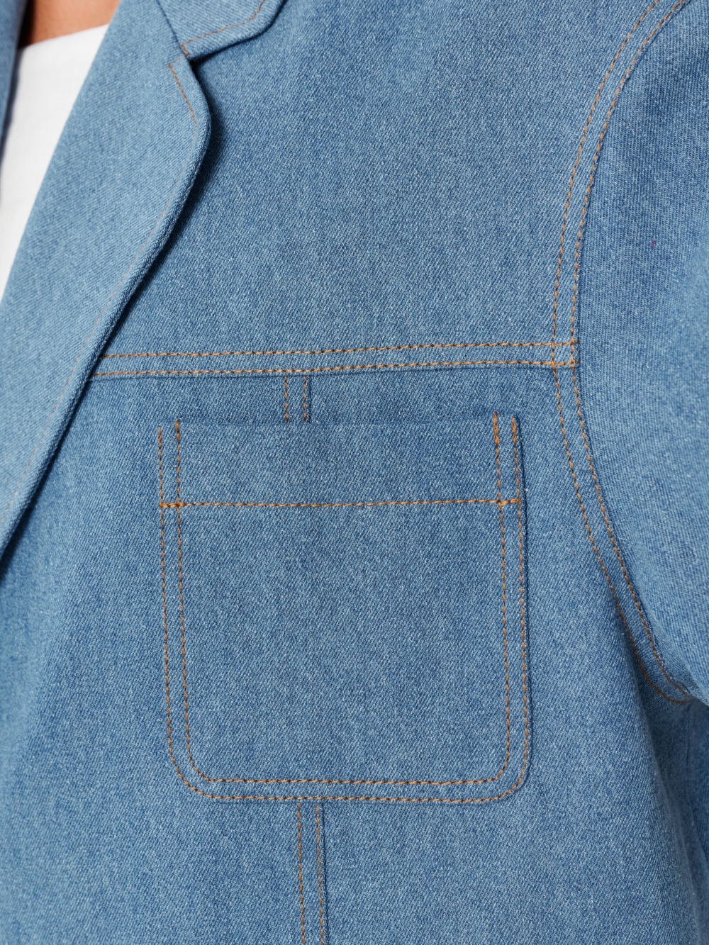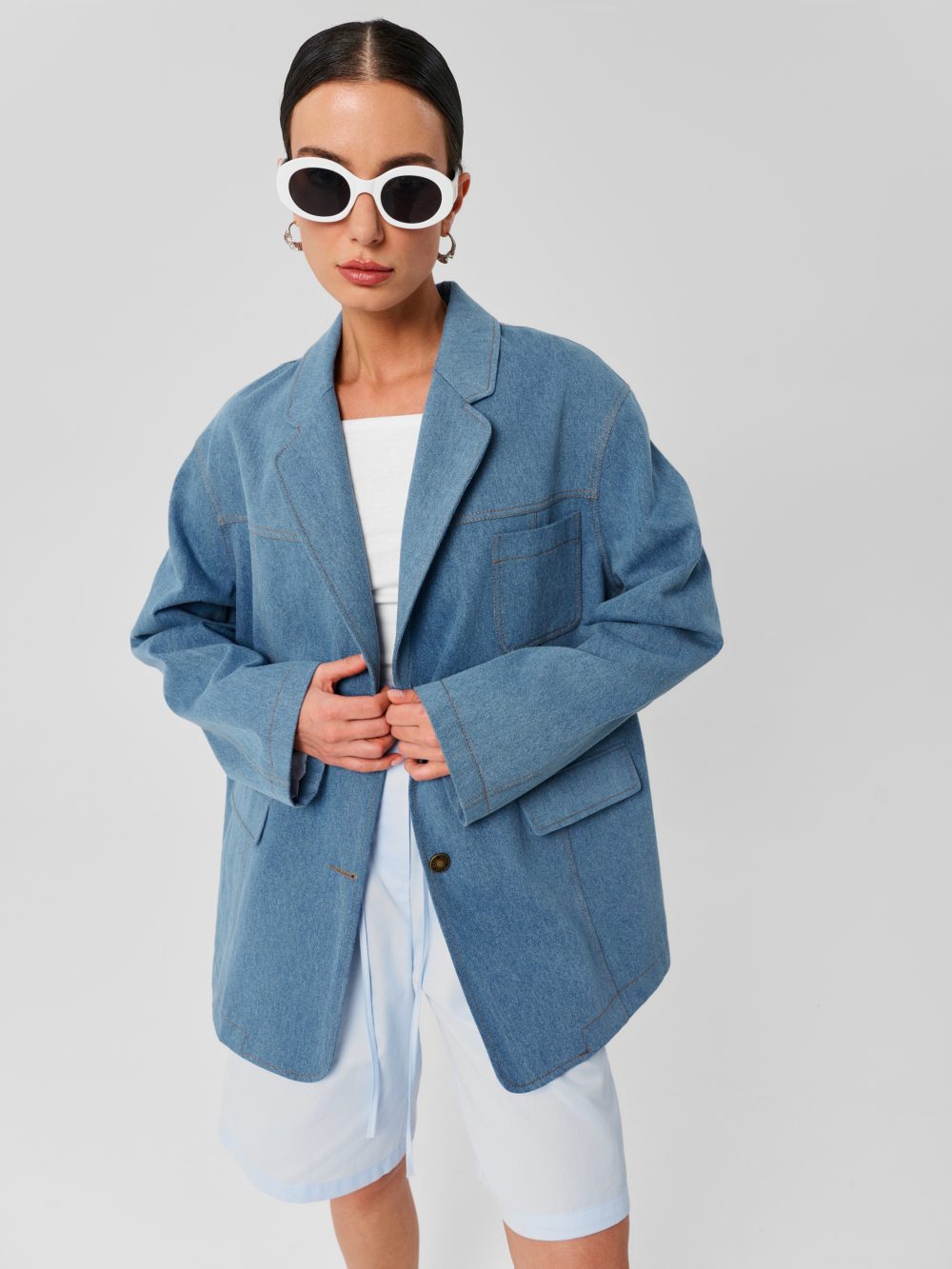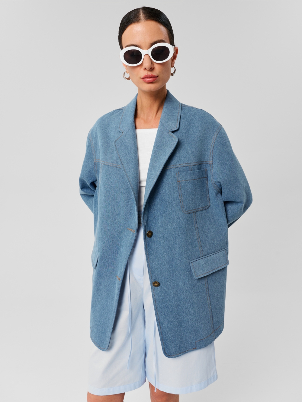 Универсальная ткань деним становится еще более популярной в сезоне весна-лето. Джинсовый пиджак насыщенного голубого цвета свободного кроя впишется в любой гардероб и внесёт разнообразие в повседневные образы. Сделано в России.
