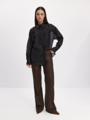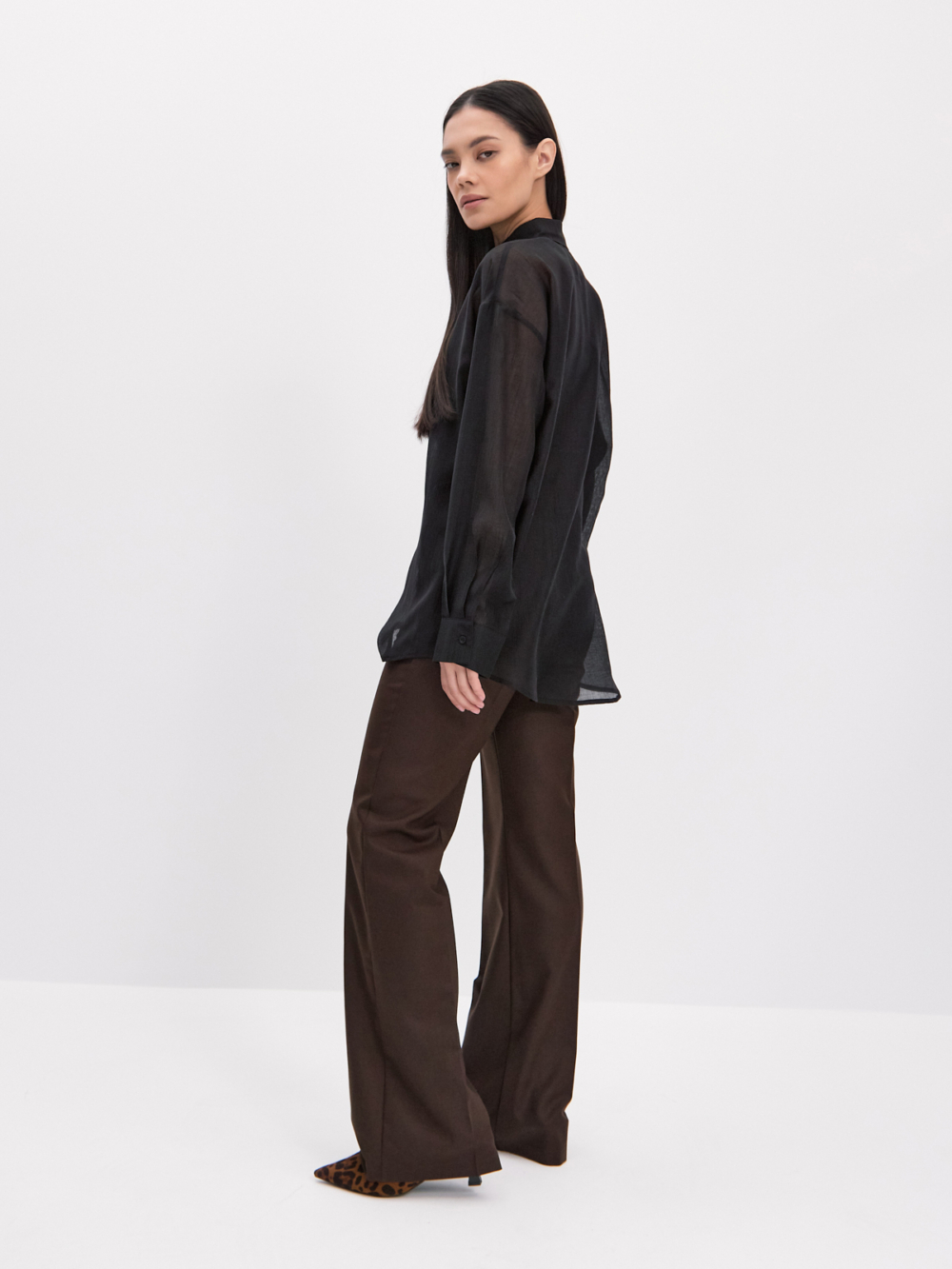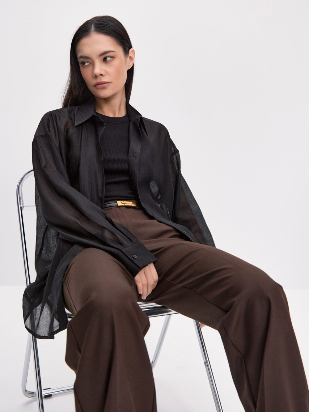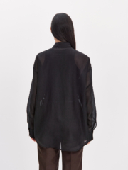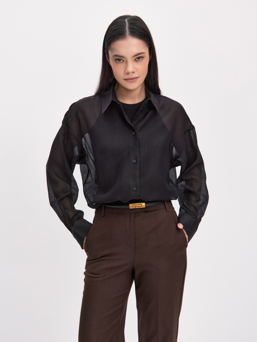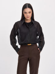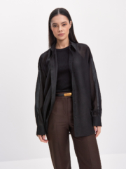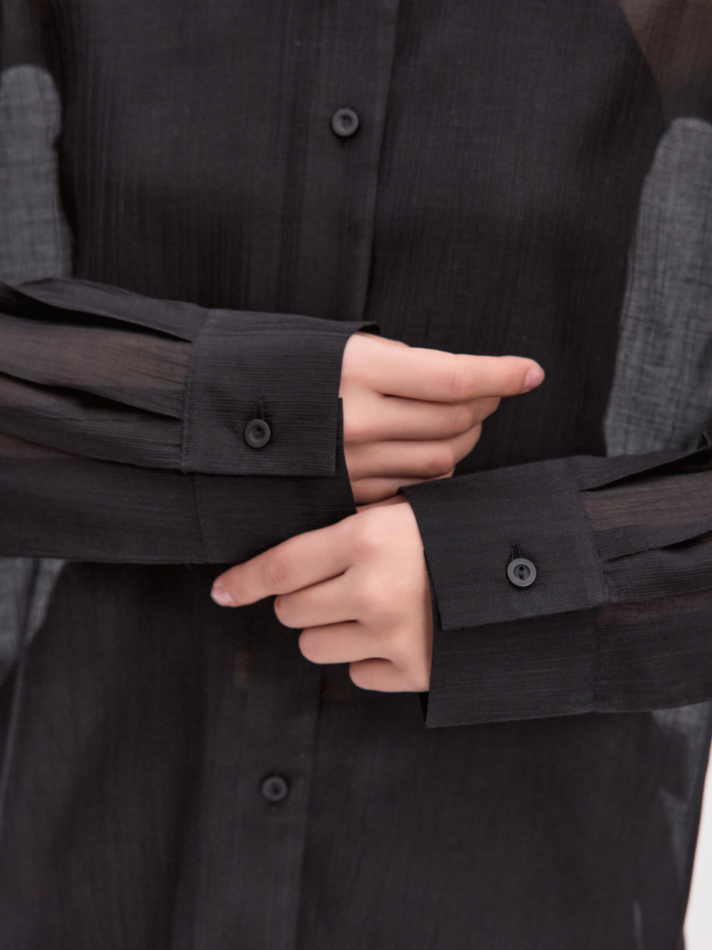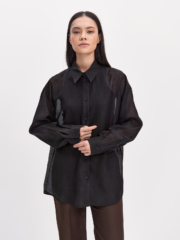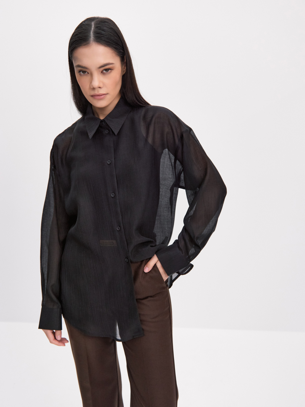 Классическая рубашка чёрного цвета со спущенным плечом и широкими манжетами дополнена отложным воротником и пуговицами в тон. Лёгкая прозрачность – изюминка этой модели, подчеркивающая нежность и воздушность рубашки. Универсальный прямой силуэт позволяет носить модель как вторым слоем поверх топа или футболки, так и первым – под жакет, заправляя в брюки или юбку. Ткань премиального качества на основе тенселя обеспечивает комфорт и отличную гигроскопичность. Модель прекрасно впишется как в повседневные образы, так и в вечерние наряды – достаточно добавить подходящие аксессуары.