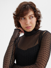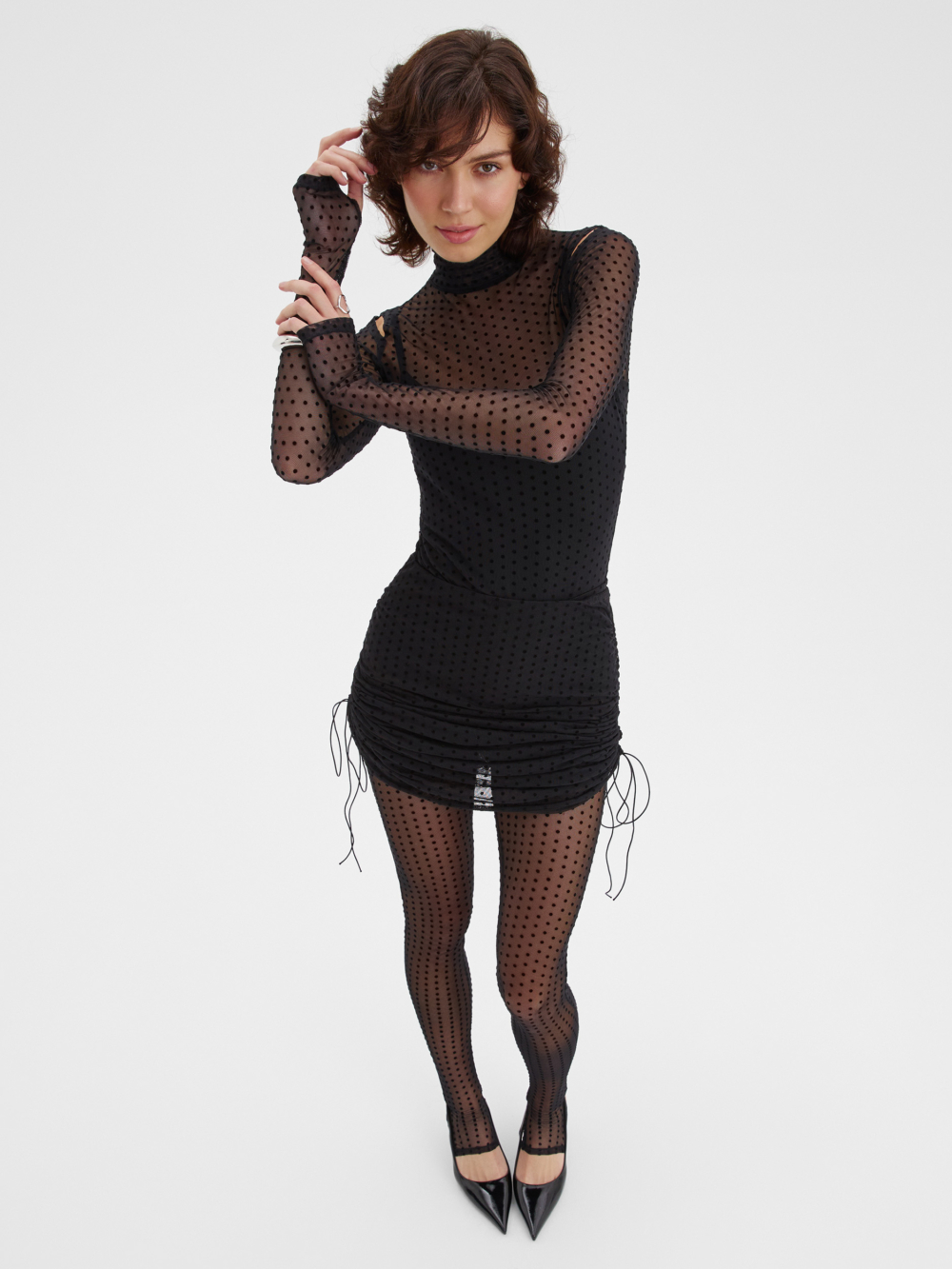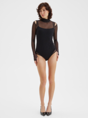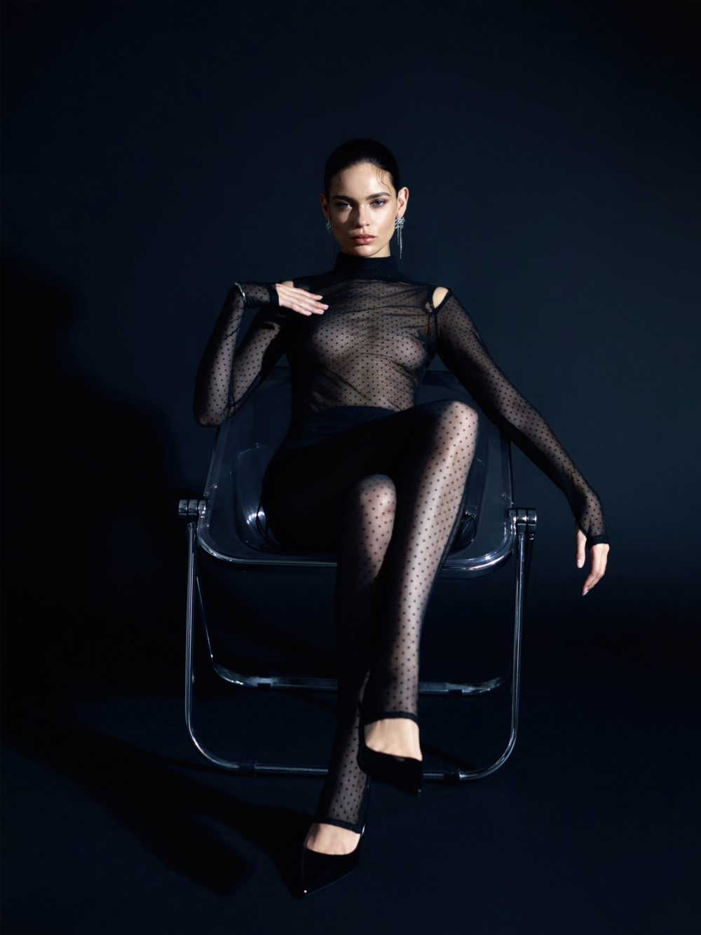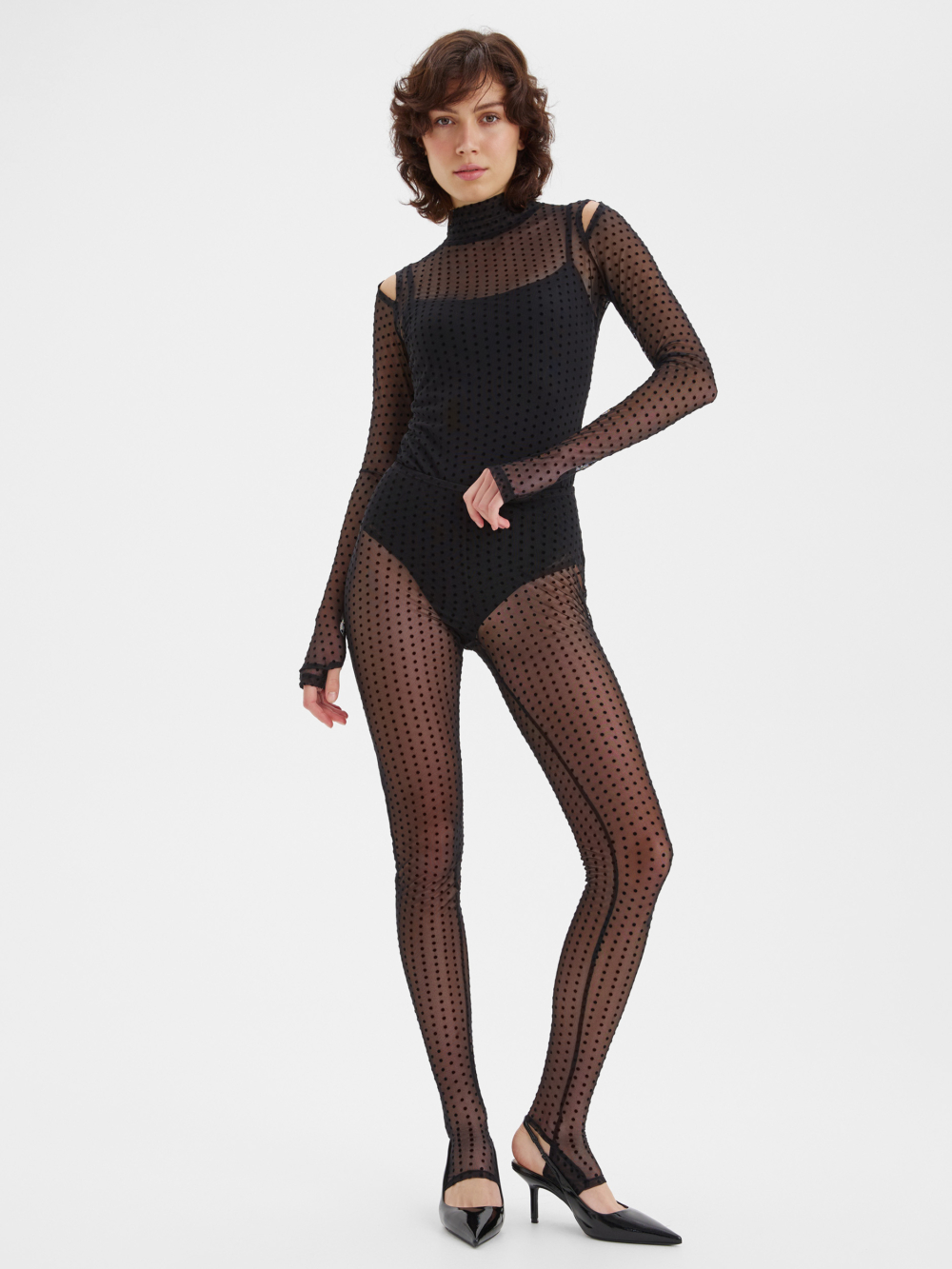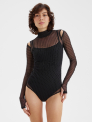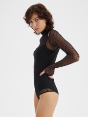 Изысканное полупрозрачное боди-водолазка в мелкий бархатный горошек с разрезами на плечах и трендовыми удлинёнными рукавами-митенками. Вы можете надеть боди на топ-бандо или поверх другого непрозрачного боди, стилизуя эту модель с легинсами и мини-юбкой, брюками буткат или юбкой годе в пол из нашей коллекции. В этом образе вы будете притягивать взгляды окружающих, очаровывая их своим магнетизмом.