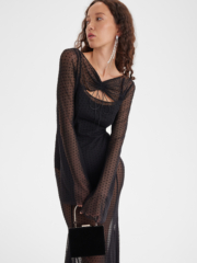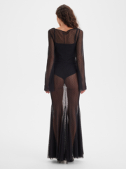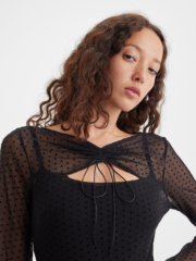 Изысканное полупрозрачное платье в пол в мелкий горошек с кулиской в верхней части лифа и расклёшенными рукавами. Вертикальные линии на платье прекрасно вытягивают силуэт и делают фигуру более изящной. Мы добавили клинья в рельефы на полочке и в средний шов на спинке для удобства передвижения и для более выразительного силуэта годе. Все эти детали платья в совокупности создают мягкую чарующую пластику, при этом не стесняя движений. Вы можете надеть поверх мини-юбку на кулиске или дополнить платье жакетом прилегающего силуэта из нашей новогодней коллекции в качестве верхнего слоя. Также мы предлагаем вам несколько вариантов стилизации с платьем-бандо, платьем-комбинацией, боди или топом бандо и мини-юбкой на кулиске. В образах из нашей новогодней коллекции вы будете притягивать взгляды окружающих, очаровывая их своим магнетизмом.