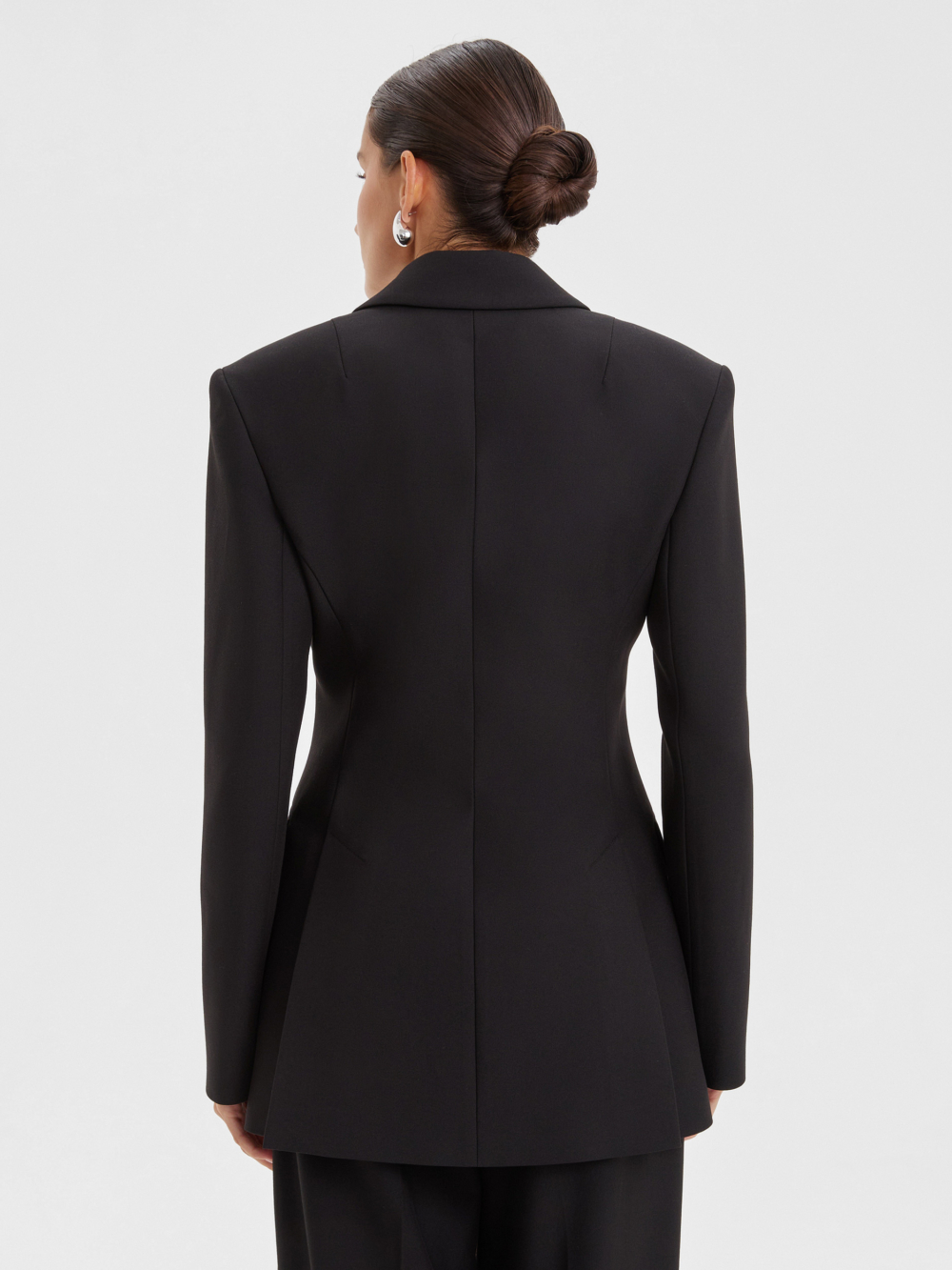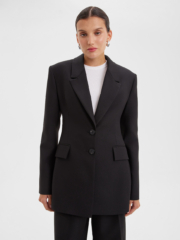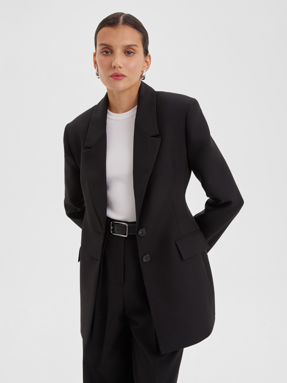 Изысканный чёрный жакет прилегающего силуэта с акцентными плечами – это отличный вариант как для собранного образа в офис, так и для вечернего выхода на мероприятие. Костюмная ткань на основе полиэстера с добавлением вискозы делает изделие износостойким и позволяет с комфортом носить в любую погоду. Комбинируйте его с брюками или юбкой из нашей коллекции, а также с аксессуарами для создания изысканного и завершенного образа.