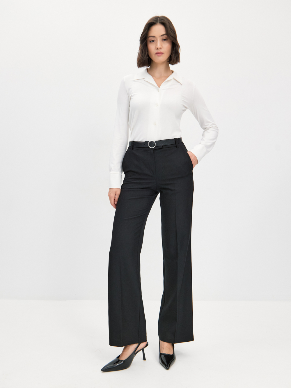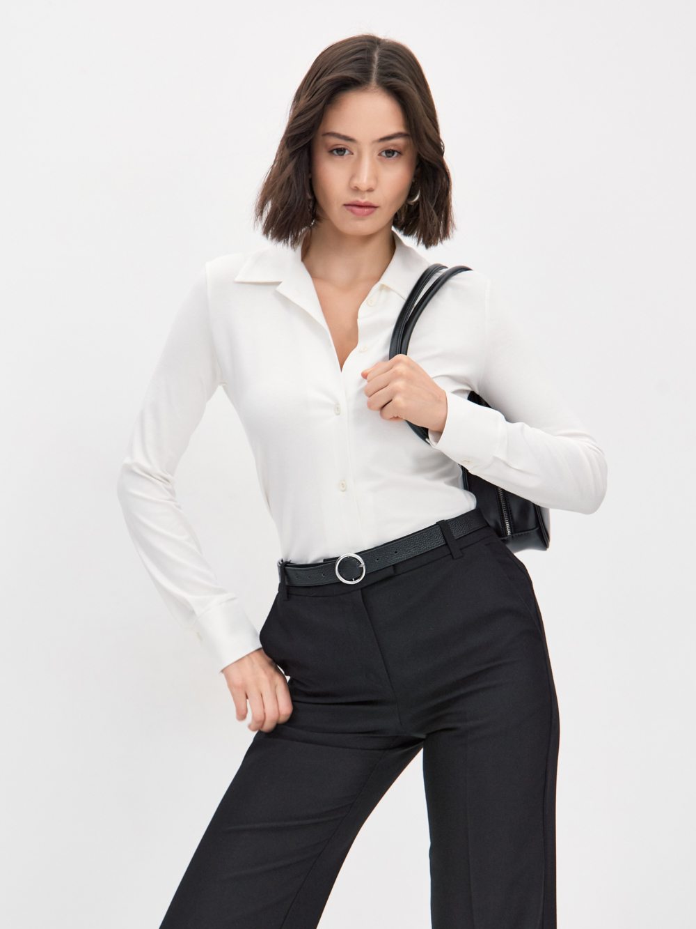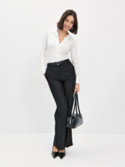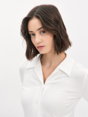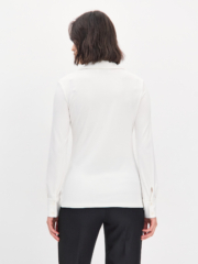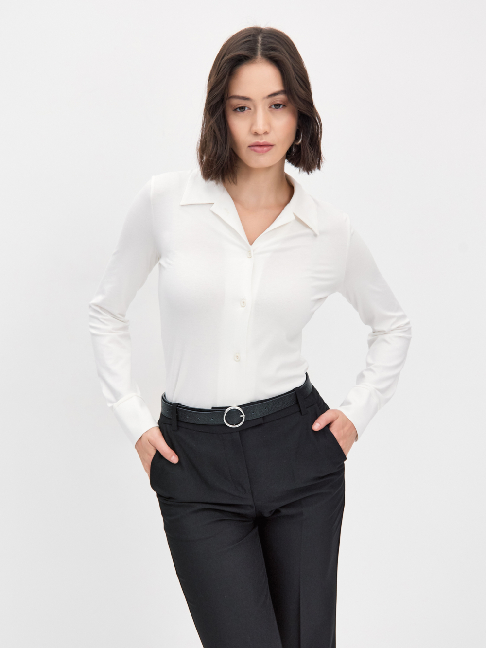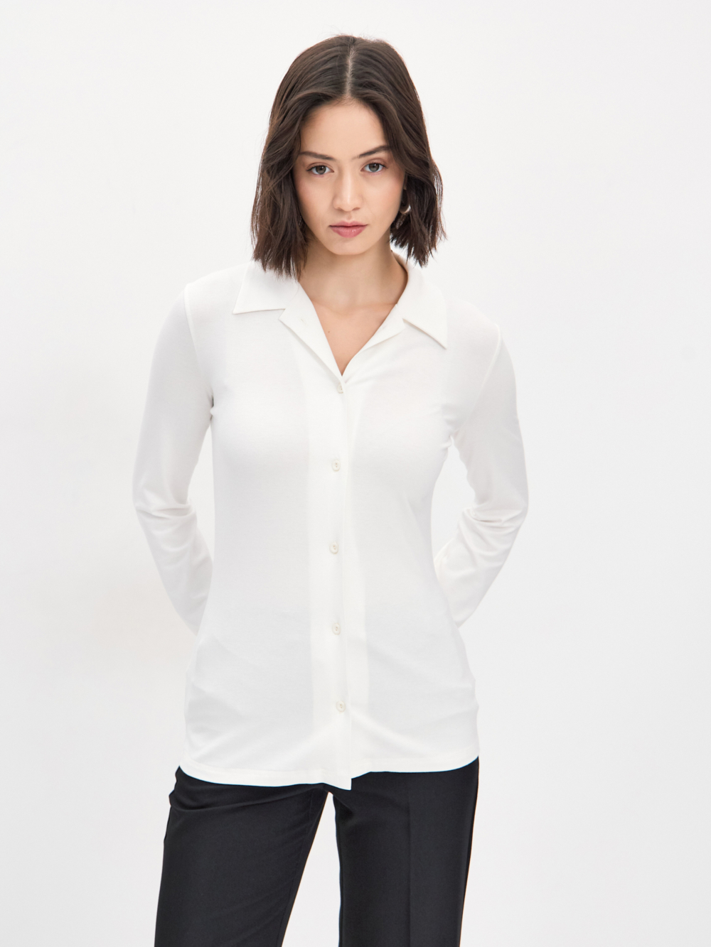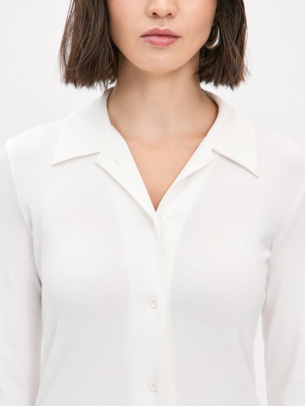 Трикотажная рубашка прилегающего силуэта с узким втачным рукавом , прекрасно вытягивает силуэт , проста в стилизации ,такую будет удобно надеть даже под прилегающий жакет. Изделие выполнено из пластичной вискозы молочного цвета , гигроскопичной и тактильно приятной , пуговицы окрашены в тон . Эту лаконичную модель легко сочетать с другими вещами — брюками , юбками , джинсами, шортами из нашей коллекции.