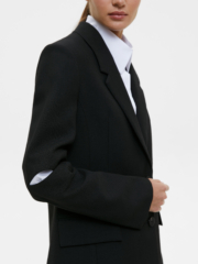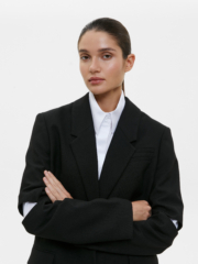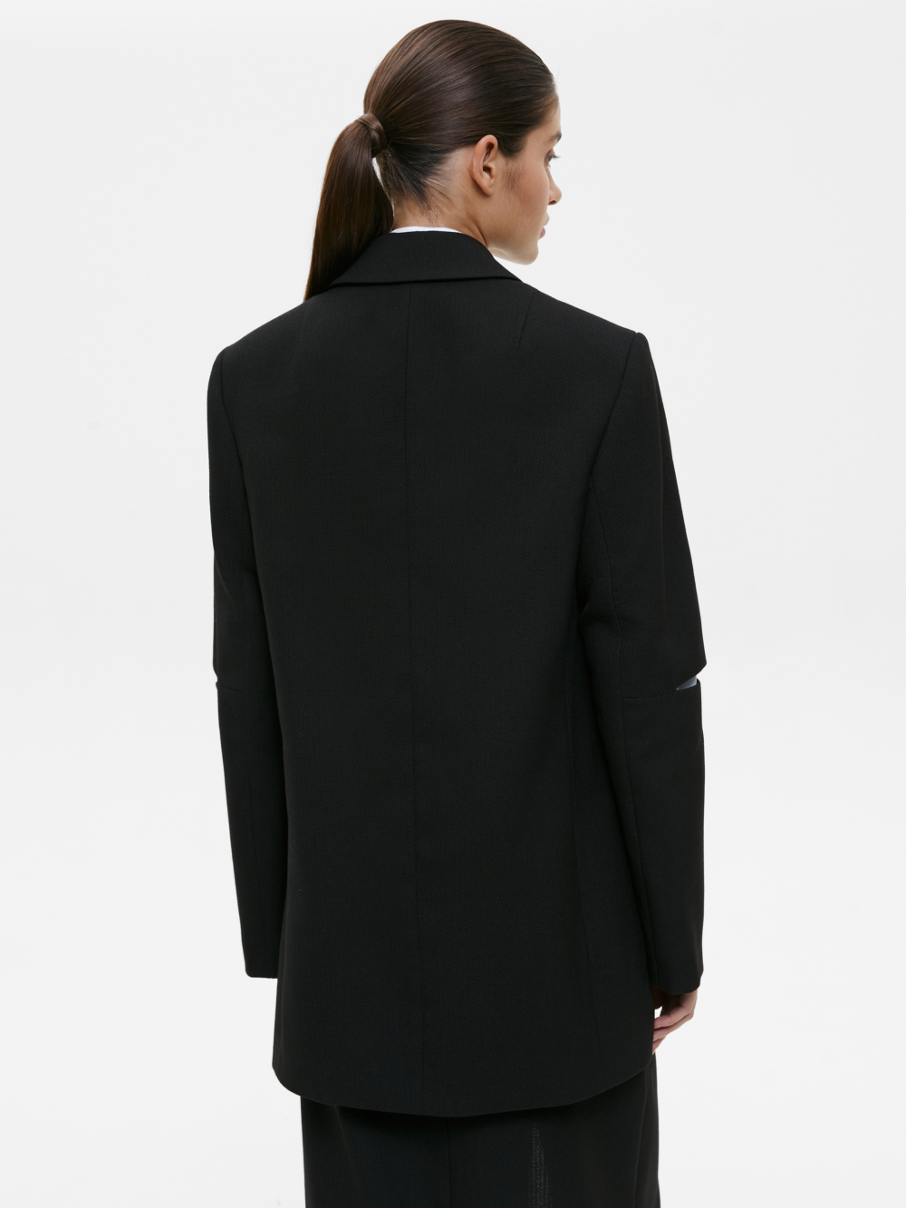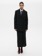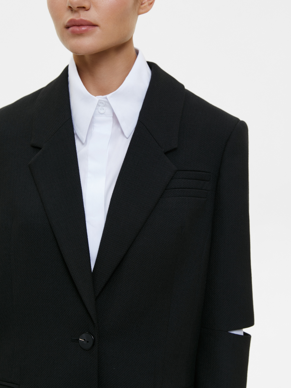 Свободный жакет с разрезами на локтях станет акцентным предметом в вашем гардеробе, а прямой крой и глубокий чёрный цвет делают его максимально простым для сочетаний. Тонкая фактурная ткань с высоким содержанием шерсти гигроскопична, изделия из неё садятся по фигуре. Сочетайте жакет с жилетом, юбкой или брюками из нашей коллекции, чтобы получить универсальный костюм для любого случая. Жакет – прекрасный выбор как для повседневных образов в офис и в университет, так и для вечерних выходов на мероприятие, если добавить в образ аксессуаров.