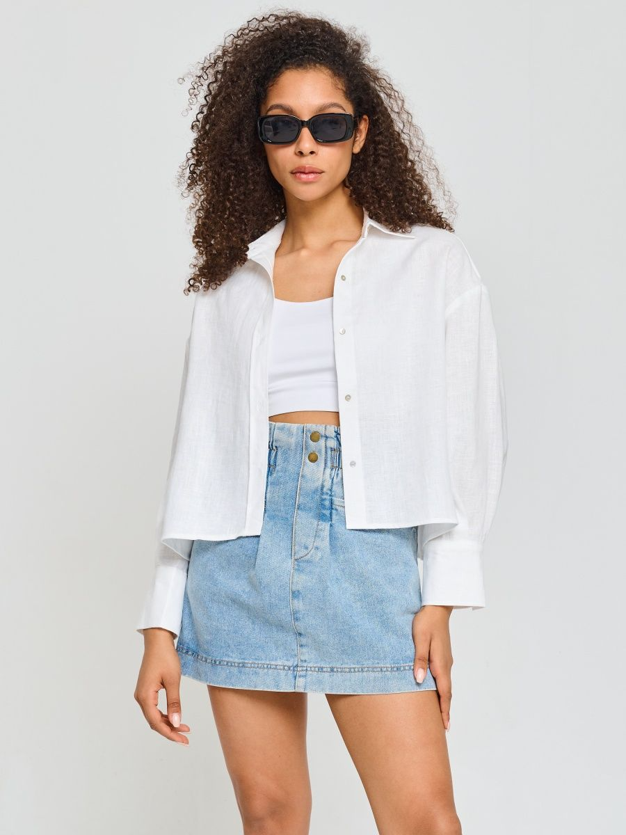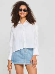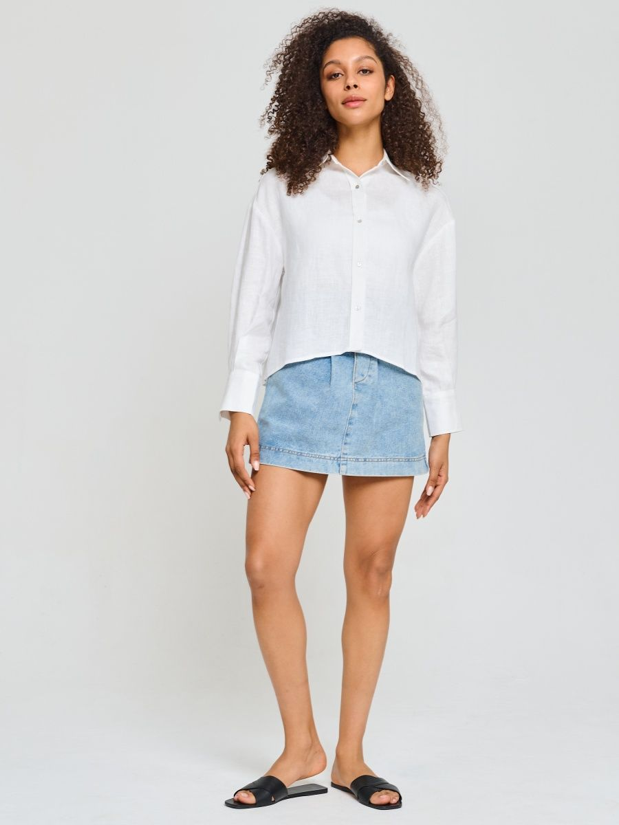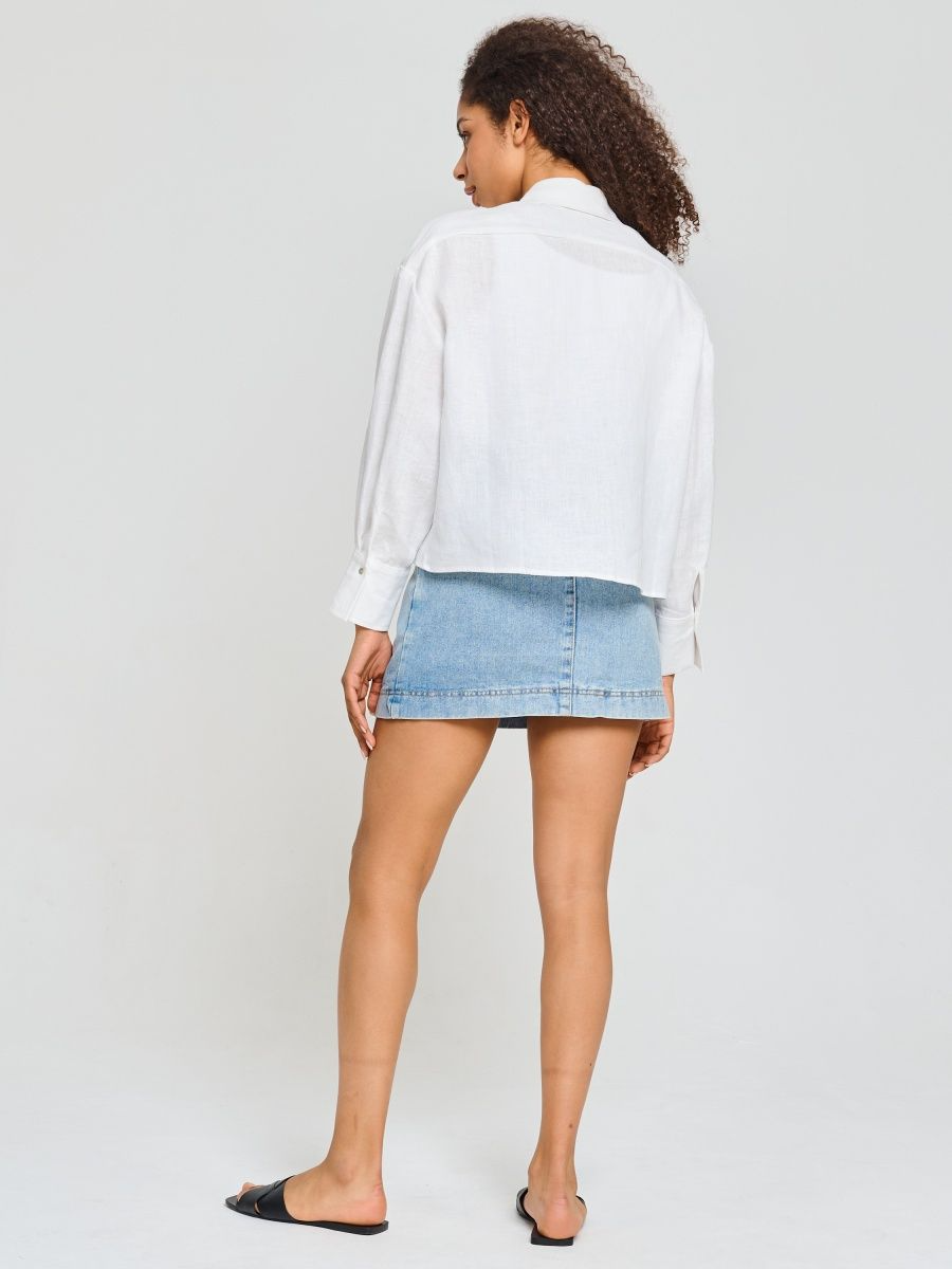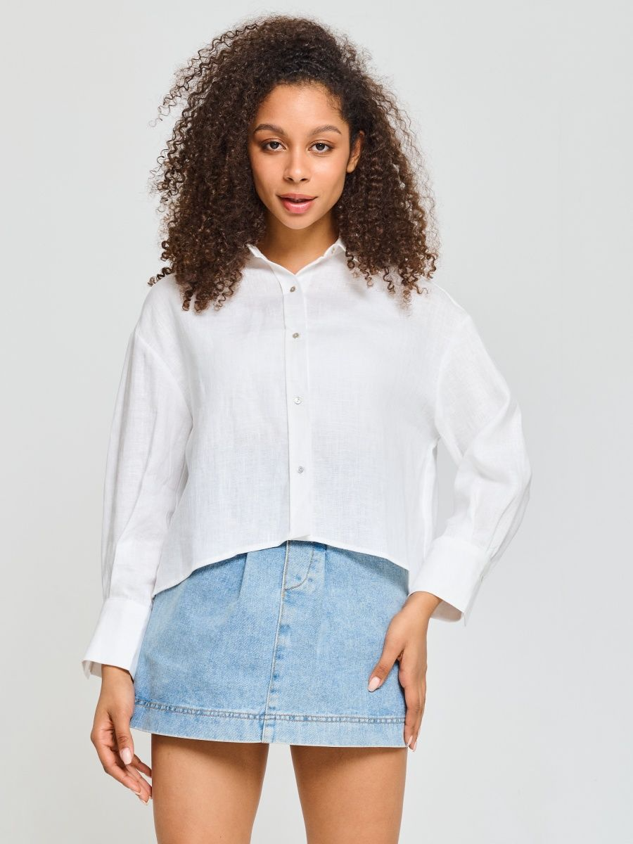 Укороченная белая льняная рубашка оверсайз с широкими манжетами и пуговицами в форме ракушек. Можно носить самостоятельно или в качестве второго слоя поверх топов и комбинаций. Тонкий матовый лён обладает характерными неровностями и утолщениями, что придаёт образу непринуждённый и расслабленный вид. Рубашка из смеси льна и вискозы мягкая и приятная на ощупь.