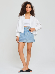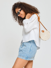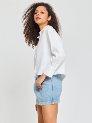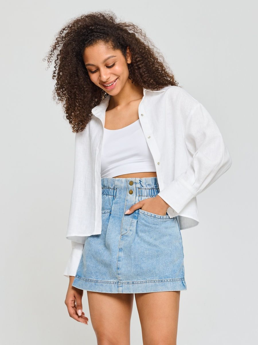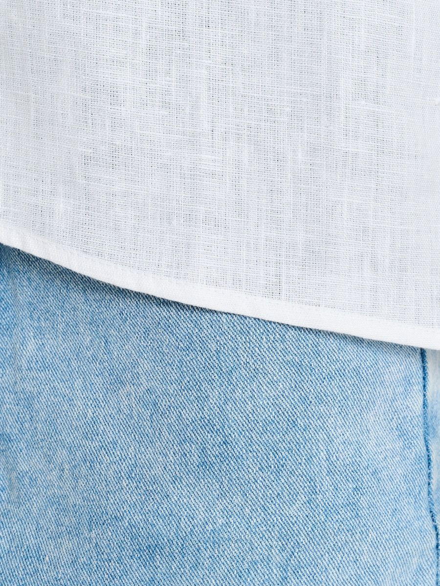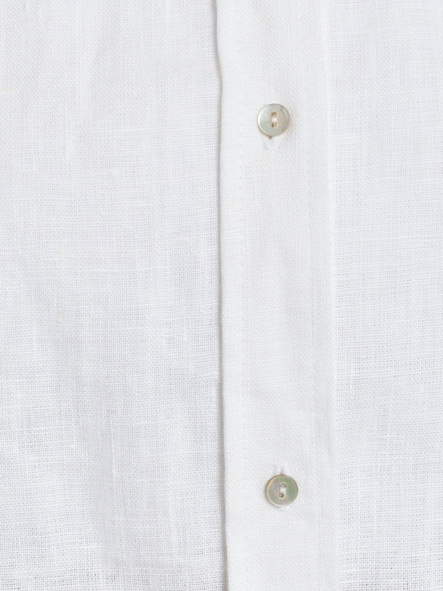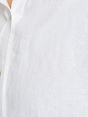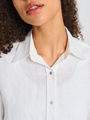 Укороченная белая льняная рубашка оверсайз с широкими манжетами и пуговицами в форме ракушек. Можно носить самостоятельно или в качестве второго слоя поверх топов и комбинаций. Тонкий матовый лён обладает характерными неровностями и утолщениями, что придаёт образу непринуждённый и расслабленный вид. Рубашка из смеси льна и вискозы мягкая и приятная на ощупь.
