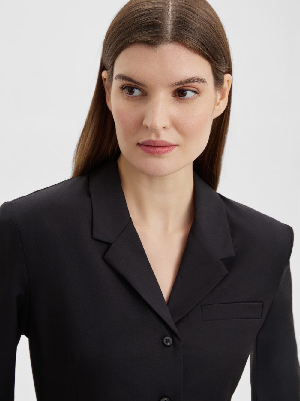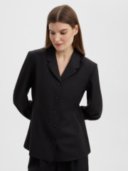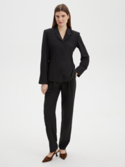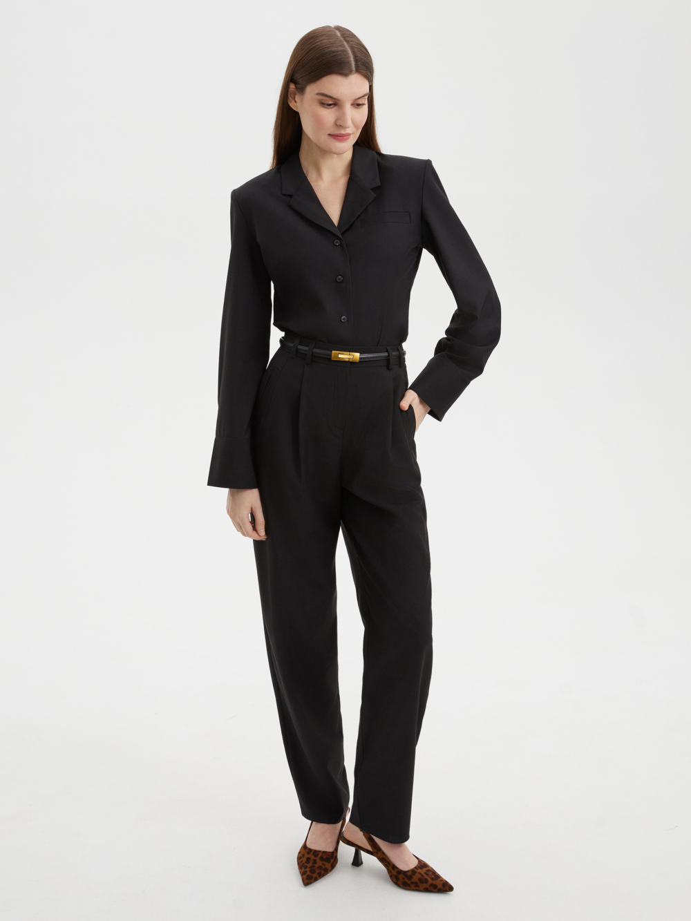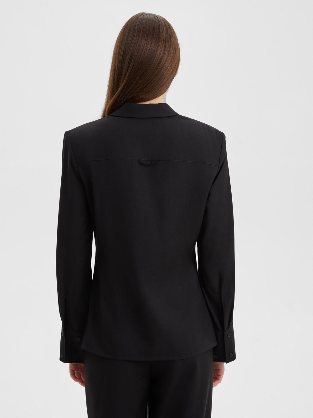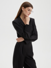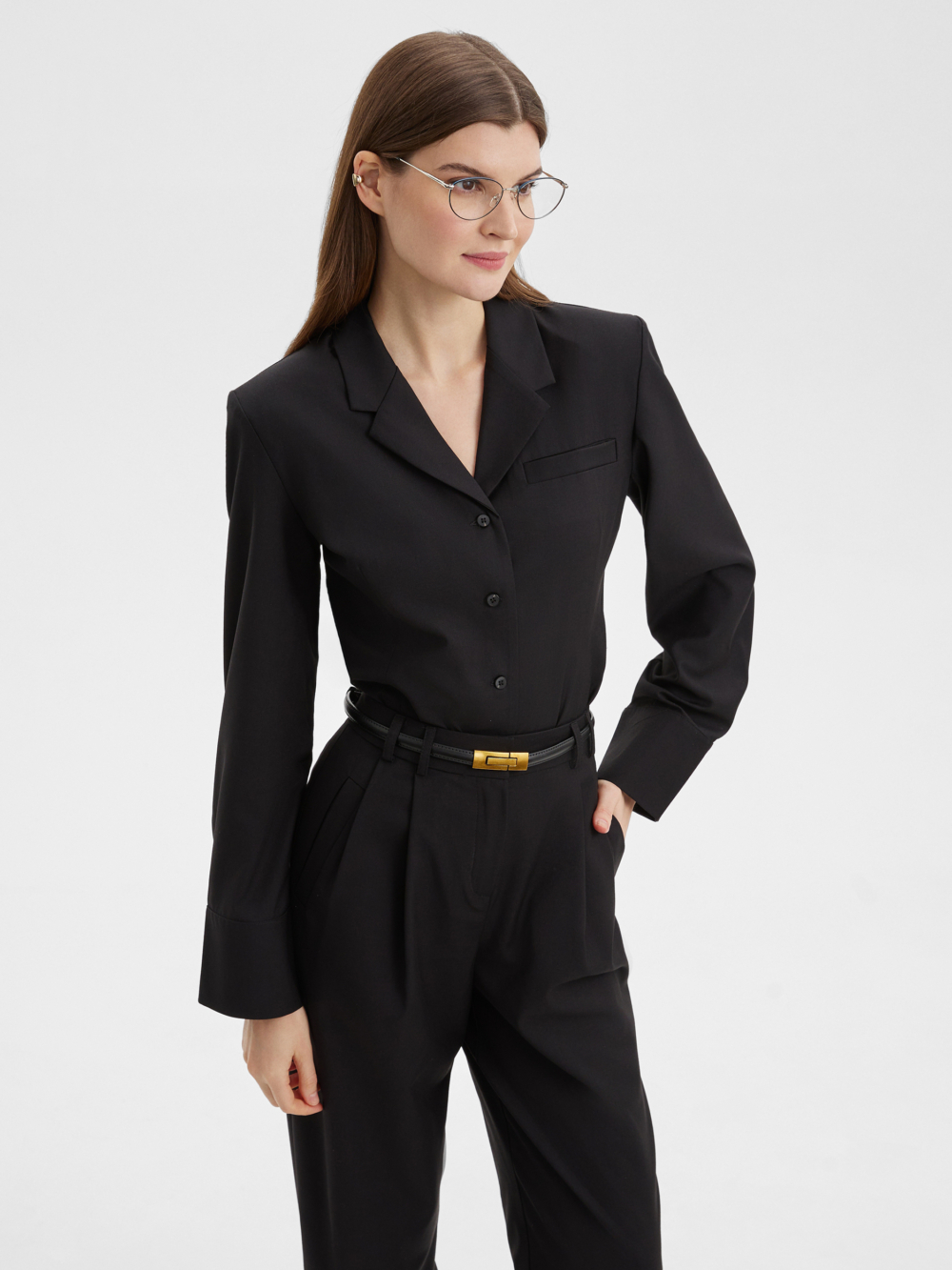 Стильная рубашка благородного черного цвета, прилегающего силуэта из костюмной ткани с четкой линией плеч. Мы добавили два ряда пуговиц на модный широкий манжет, который вы можете застегнуть уже или шире по своему желанию. Структурная ткань черного цвета на основе нарутальных и синтетический волокон, тактильно приятна, гигроспопична, обладает высокой износостойкостью и низкой сминаемостью. Сочетайте рубашку с брюками из нашей коллекции для создания собранного и стильного образа.
