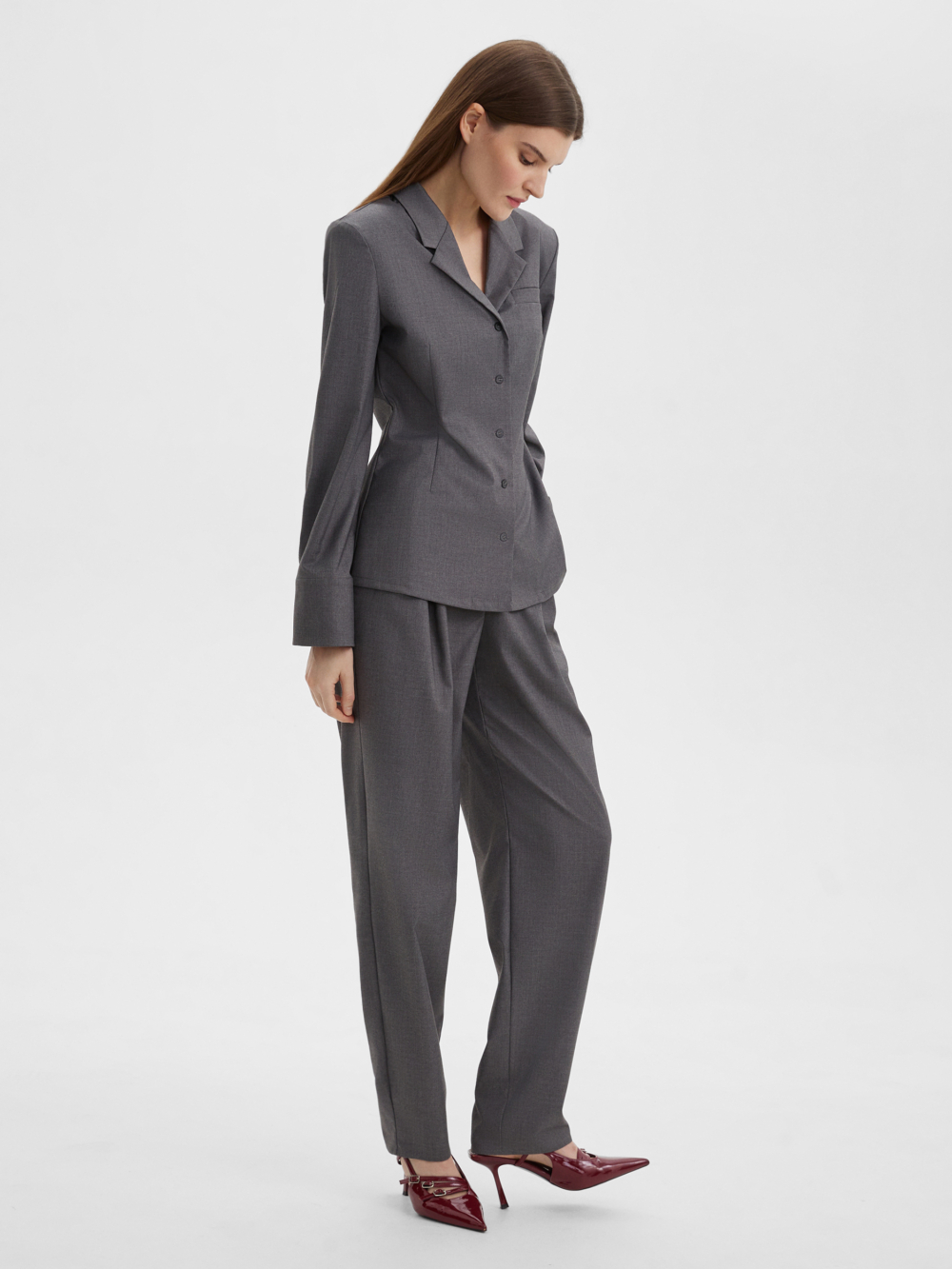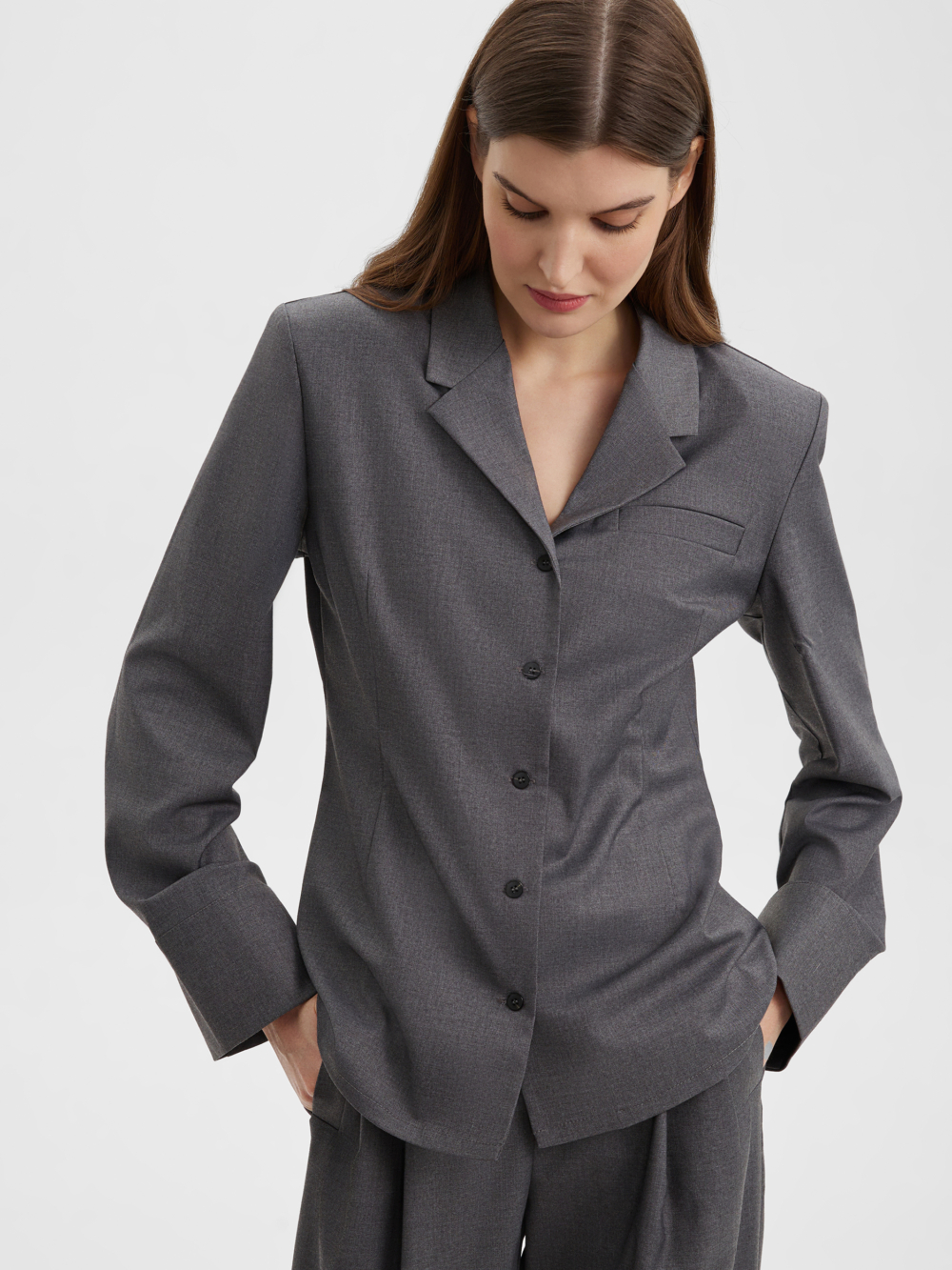Стильная рубашка благородного серого цвета, прилегающего силуэта из костюмной ткани с четкой линией плеч. Мы добавили два ряда пуговиц на модный широкий манжет, который вы можете застегнуть уже или шире по своему желанию. Структурная ткань серого цвета на основе нарутальных и синтетический волокон, тактильно приятна, гигроспопична, обладает высокой износостойкостью и низкой сминаемостью. Сочетайте рубашку с брюками из нашей коллекции для создания собранного и стильного образа.