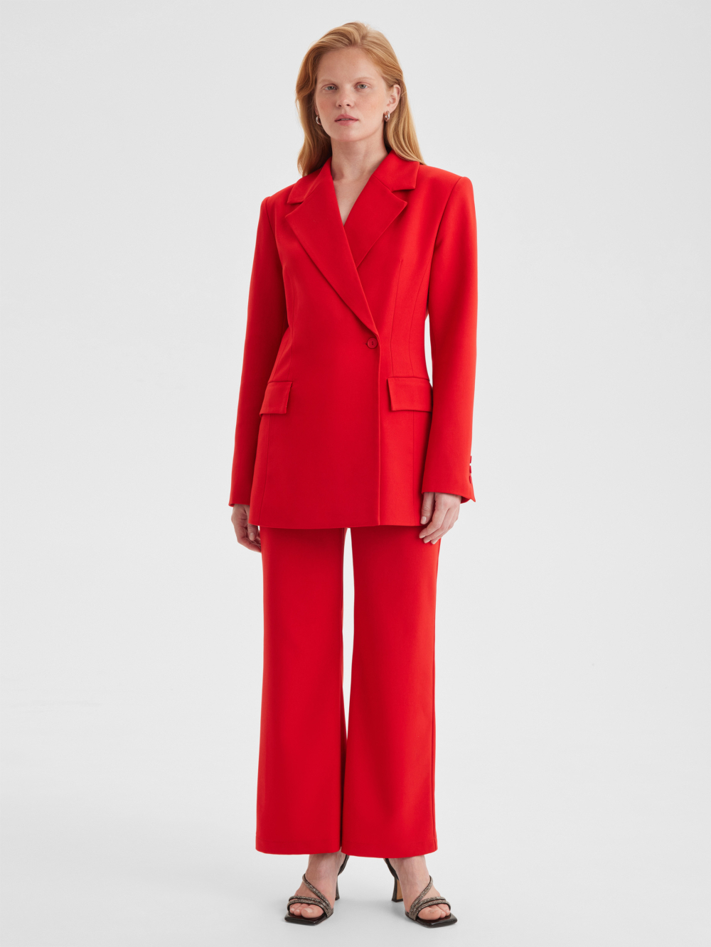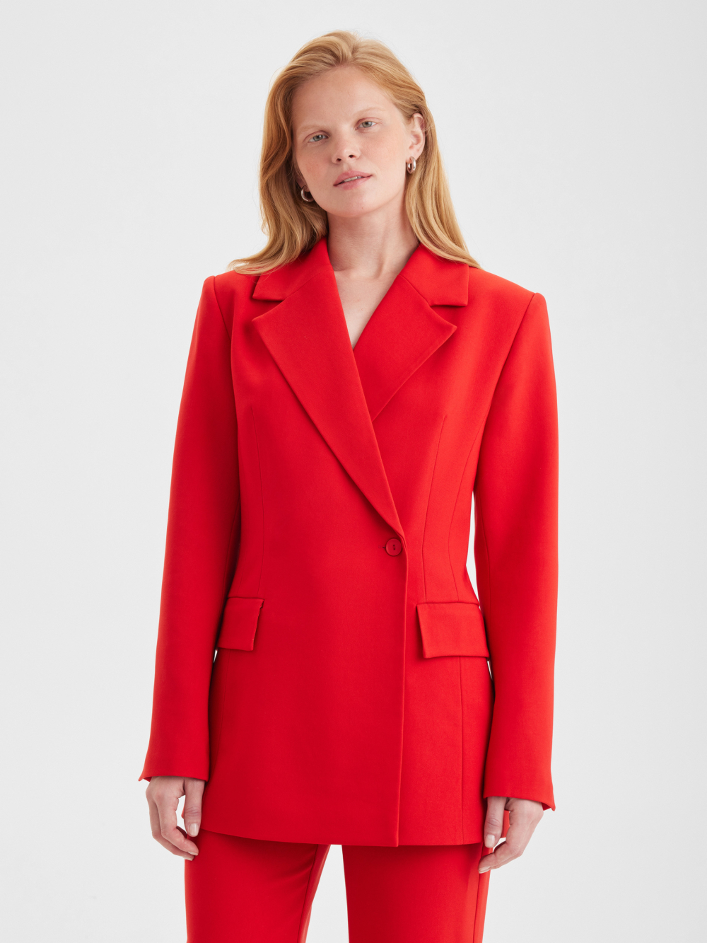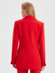 Пиджак приталенного силуэта выполнен из плотной костюмной ткани яркого красного цвета. Добавьте к пиджаку брюки из нашей коллекции для создания эффектного образа на мероприятие или сочетайте с джинсами для стильных повседневных выходов.