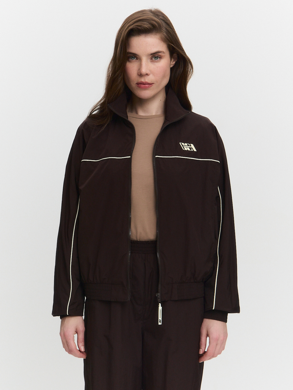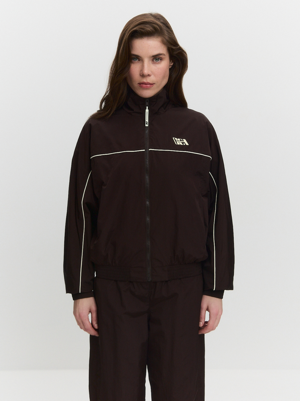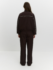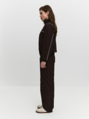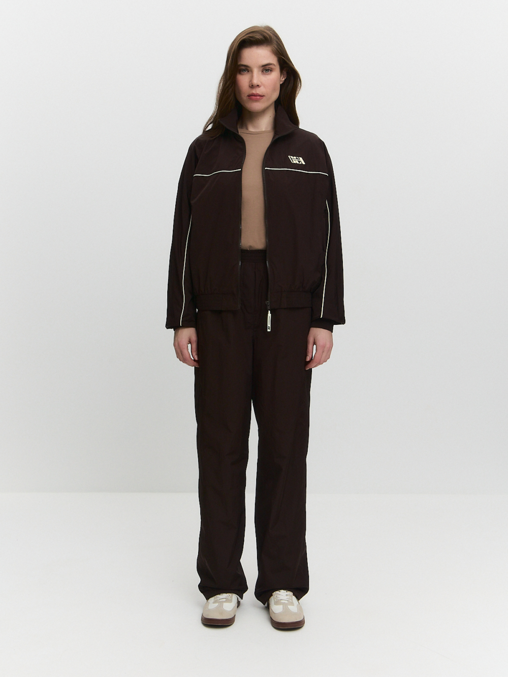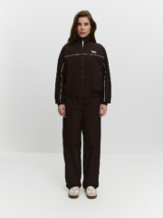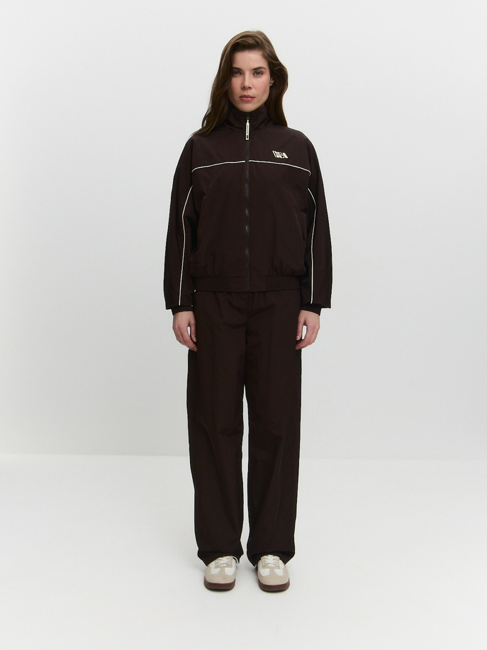 Стильный, практичный и универсальный спортивный костюм из плащевой ткани – прекрасный выбор для занятий спортом, отдыха, путешествий. Костюм состоит из ветровки со спущенной линией плеч, с отрезной контрастной кокеткой и с застёжкой-молнией и прямых брюк с регулируемым поясом без бокового шва, дополненных кулиской по низу изделия. Этот костюм — идеальный выбор для тех, кто ценит качество, комфорт и оригинальность в одежде.