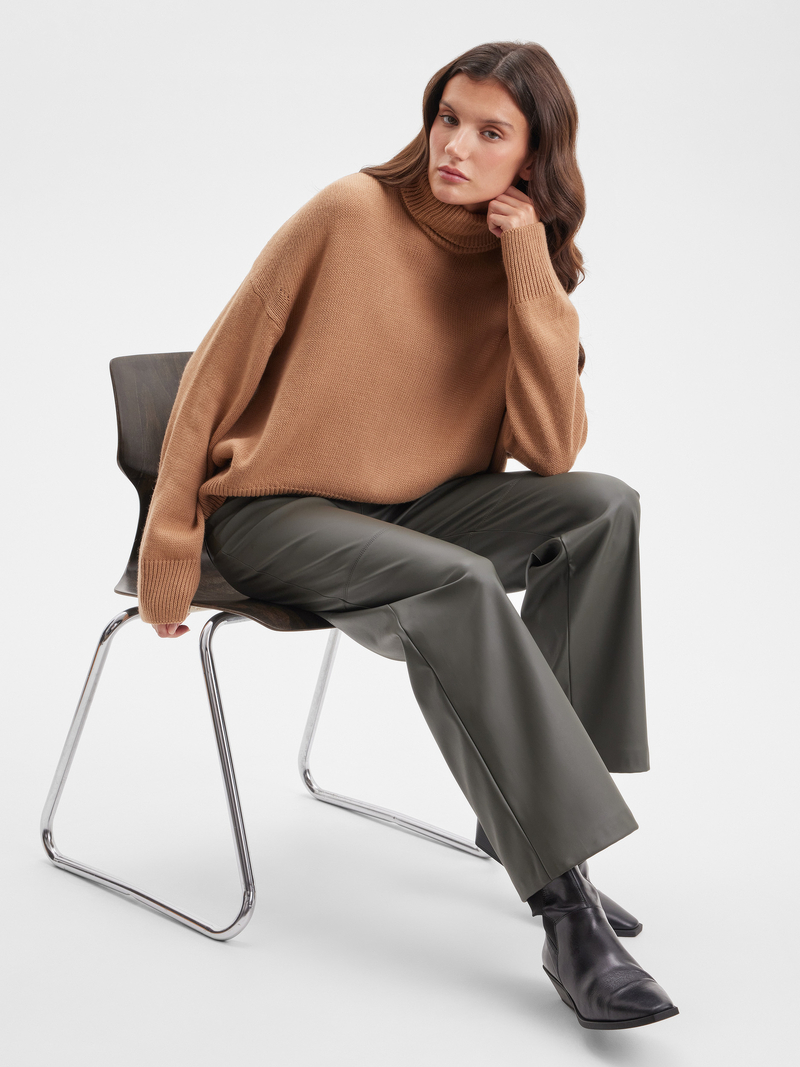 В коллекции OCH доступно несколько цветов брюк из экокожи: в благородных коричневом, зеленом оттенках, а также в классическом черном. Стилизовать их можно с любым верхом, но особенное осеннее уютное настроение добавит, конечно, наш объемный уютный свитер.