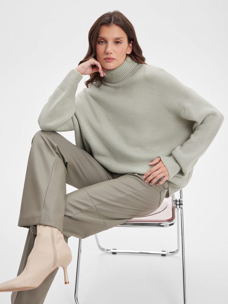 Еще одна беспроигрышная идея для тех, кто составляет базовый гардероб на осень и зиму – это сочетание оверсайз свитера из мягкого трикотажа и брюк из фактурной экокожи прямого кроя.
