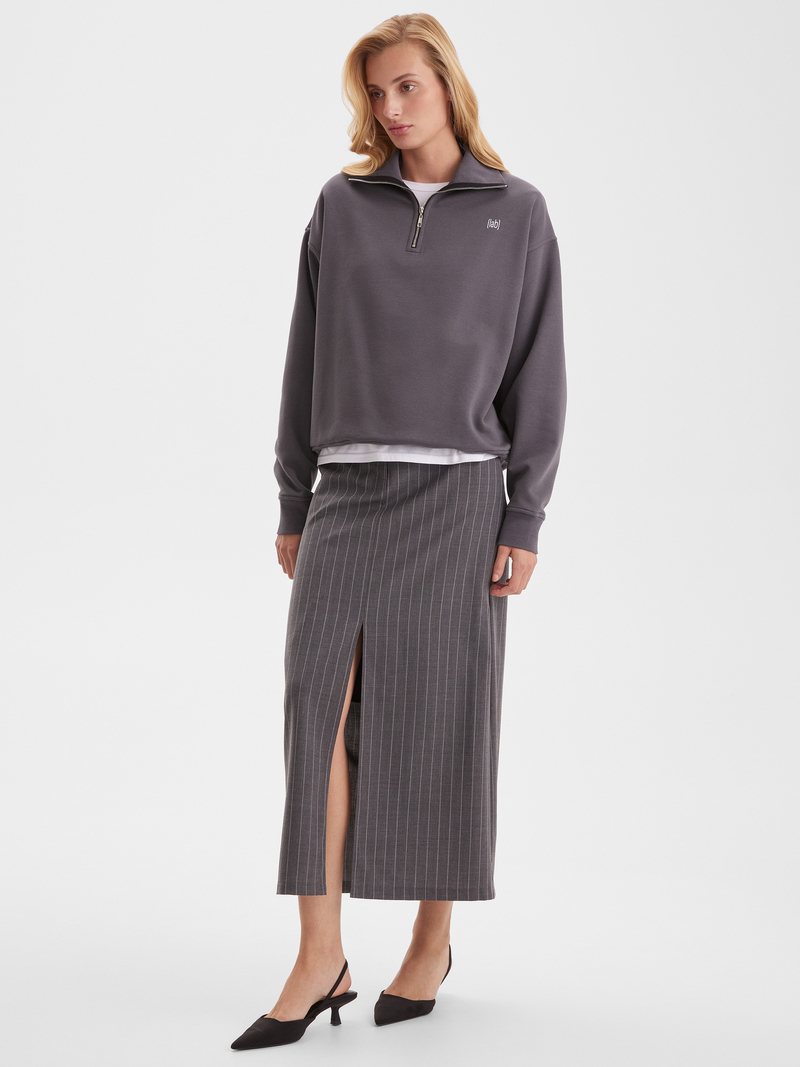 - Комбинация из мягкой толстовки и макси-юбки: такой образ идеально подойдет для утреннего кофе в любимом кафе или прогулки по осеннему парку.